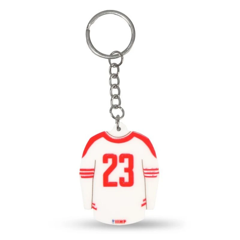 Brelok Koszulka Hokejowa Polska (Away) Pokaż swoje wsparcie dla reprezentacji Polski w hokeju na lodzie z tym unikalnym brelokiem w kształcie koszulki meczowej. Idealny dla kibiców i miłośników sportu, ten brelok to doskonały dodatek do kluczy, plecaka czy torby. Główne cechy: Design: Wersja oficjalnej koszulki hokejowej reprezentacji Polski w biało-czerwonych barwach. Z przodu znajduje się herb Polski oraz napis "Polska", dodając brelokowi patriotycznego charakteru. Czerwone detale na rękawach i ramionach podkreślają sportowy styl. Numer "23" na plecach: Na odwrocie widoczny jest czerwony numer "23" oraz logo Międzynarodowej Federacji Hokeja na Lodzie (IIHF), co dodaje autentyczności i sprawia, że brelok wygląda jak prawdziwa koszulka hokejowa. Zalety: Wytrzymały i lekki Praktyczny dodatek dla kibiców Doskonała pamiątka z meczu lub wydarzenia sportowego Ten brelok to świetny sposób na wyrażenie wsparcia dla polskiej drużyny hokejowej oraz doskonały prezent dla każdego fana.
