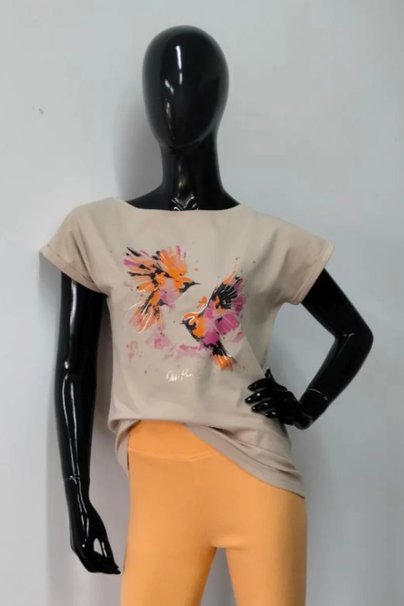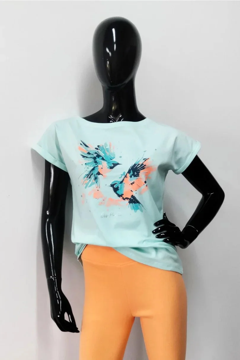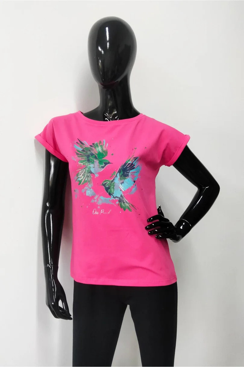 Dámská halenka s krátkými rukávy zakončenými ohrnutím. Zdobí ji barevný potisk s třpytivými prvky. Rovný střih s kulatým výstřihem. Tričko je vyrobeno z bavlny s přídavkem elastanu.