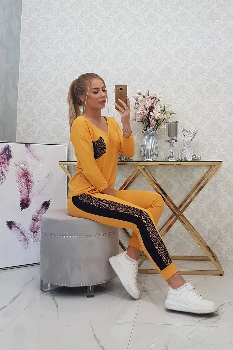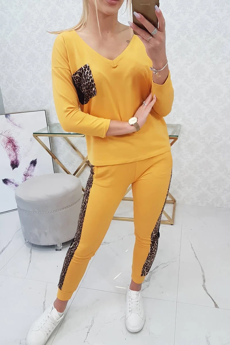 Představujeme vám sadu halenky a kalhot. Sada má vložky s motivem pantera. Halenka s kapsičkou na přední straně. Kalhoty mají kapsy. Sada je vyrobena z vysoce kvalitního materiálu. Velikost je univerzální a vyhovuje dámám, které nosí velikost S, M nebo L.