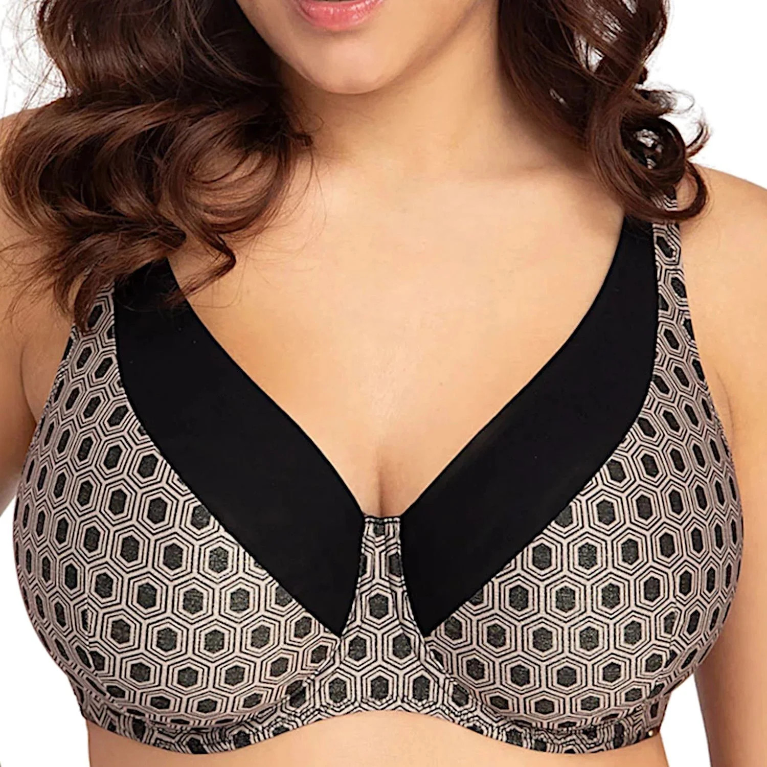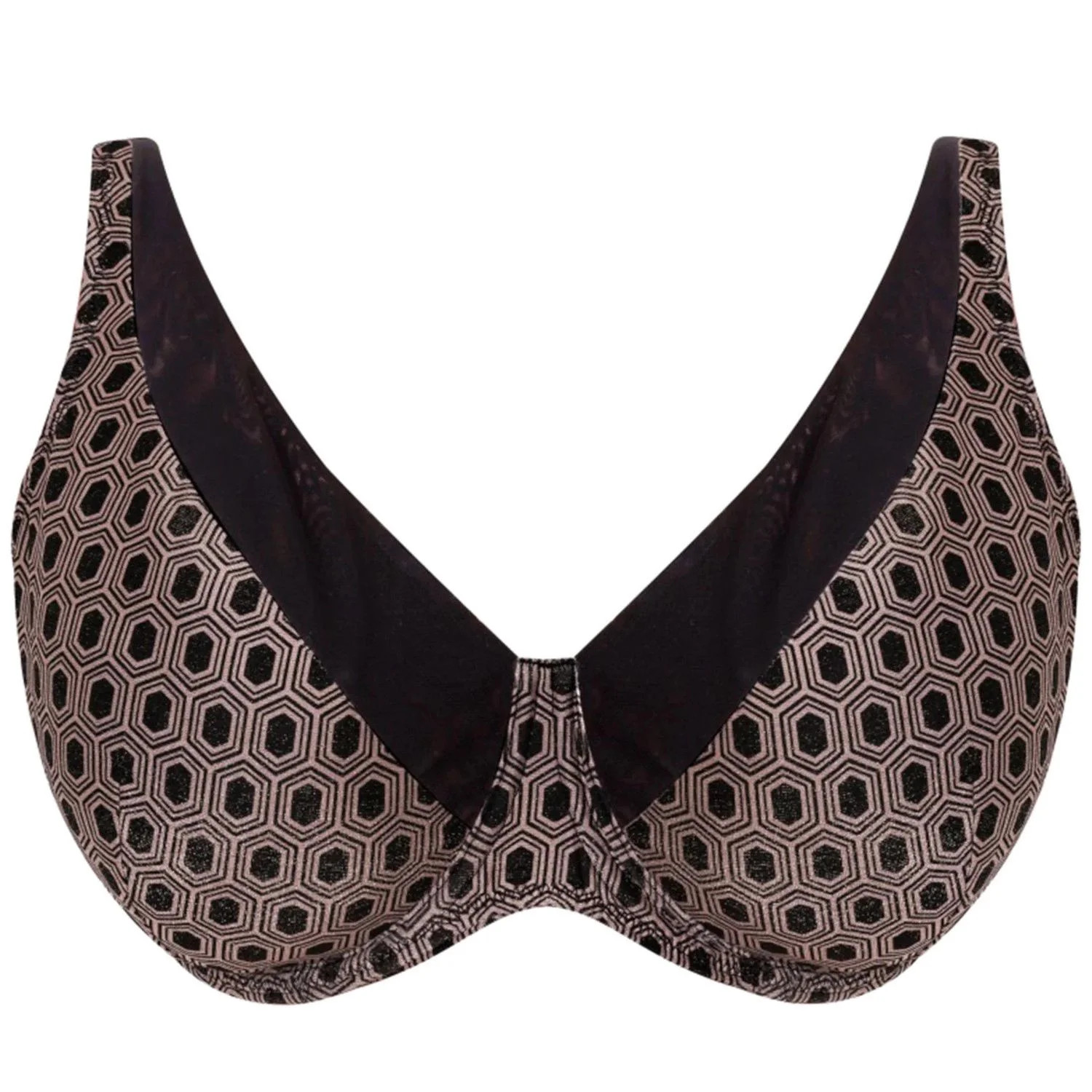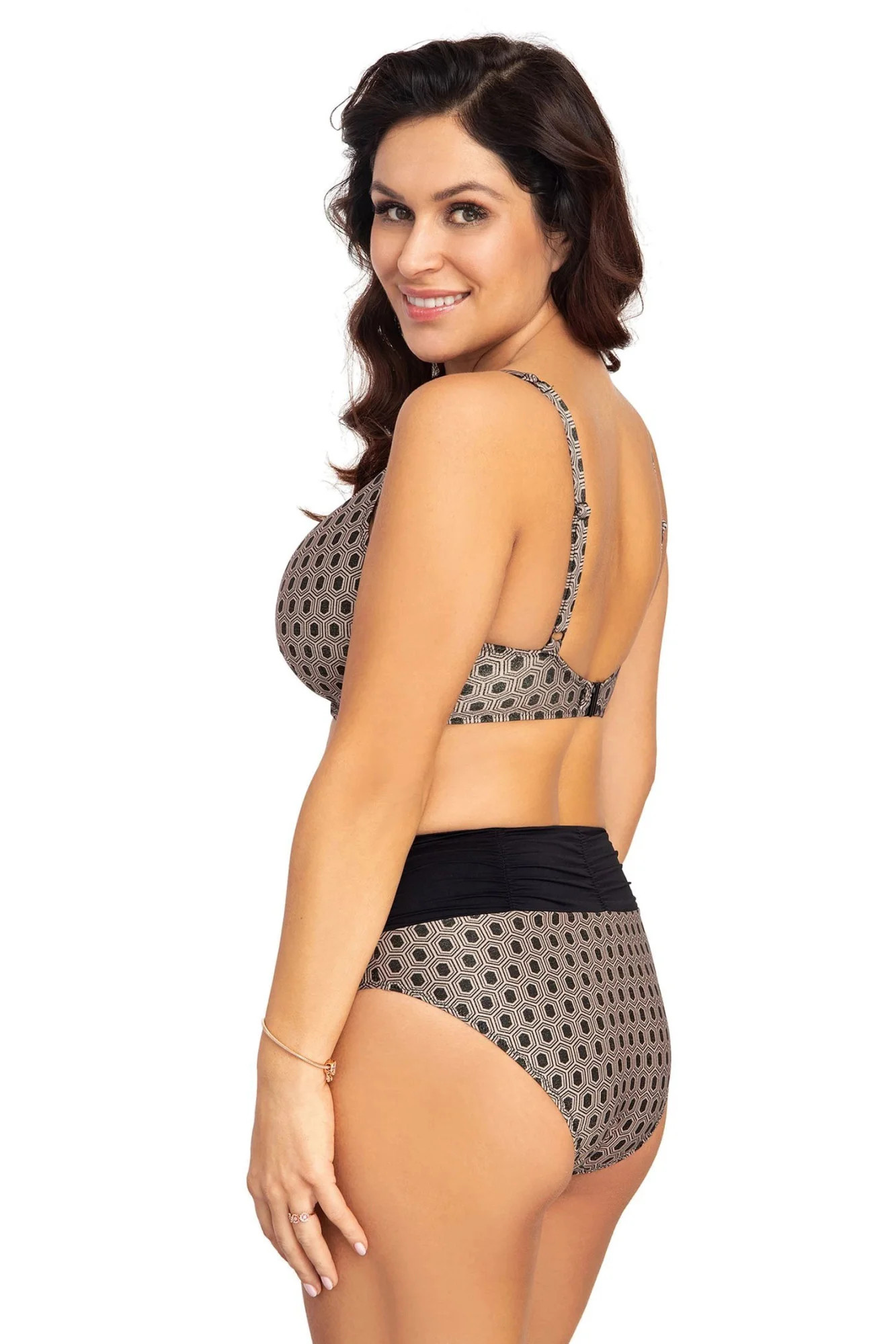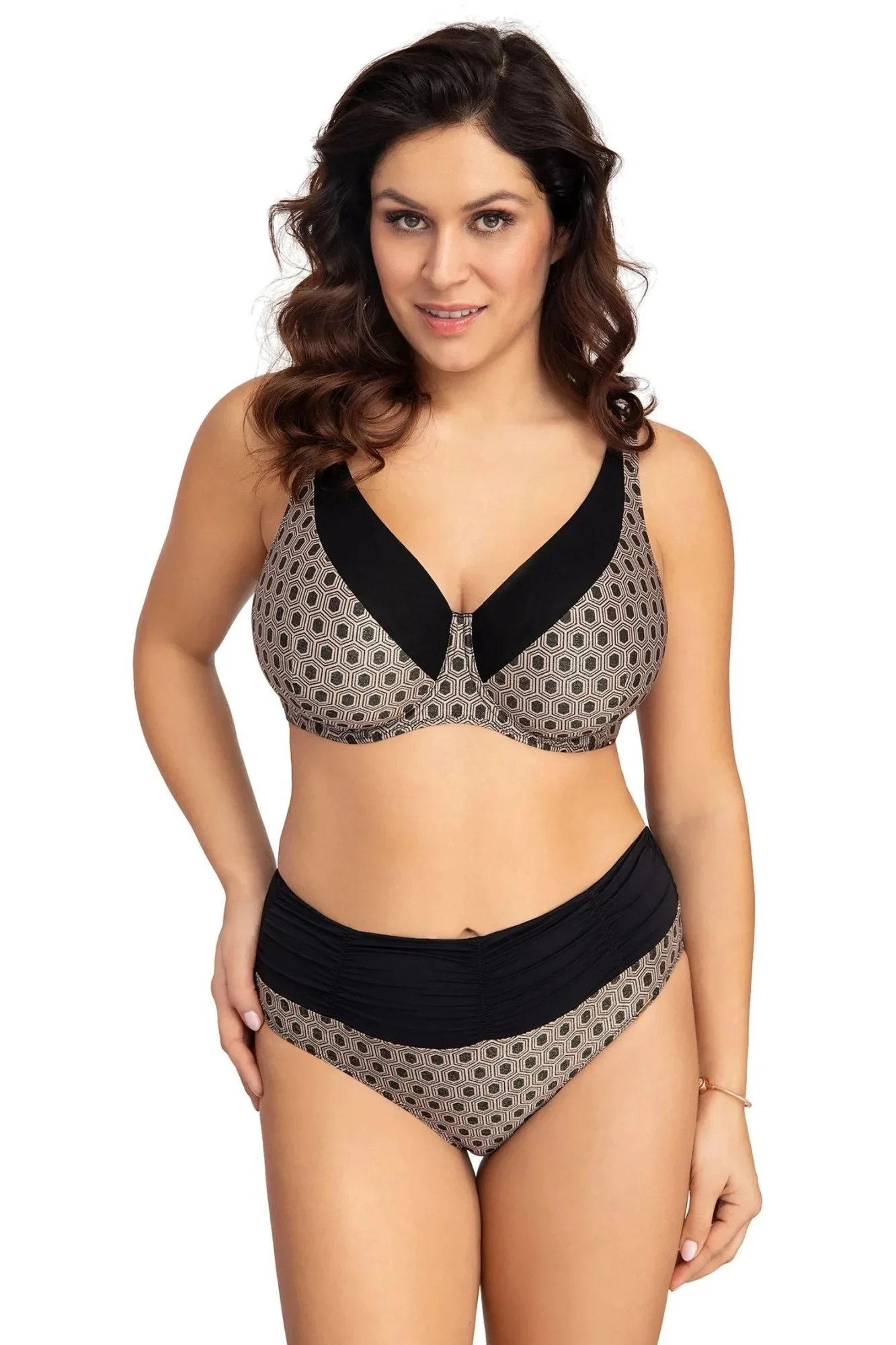 Horní díl plavek 11414 Christina CORIN - černá barva - geometrický vzor za zlatém podkladu - měkké košíčky ve tvaru trojúhelníku - s dráty obepínající poprsí - horní část z dvojité vrstvy černého tylu - ramínka spojená s košíčky - neodepínatelná a posuvná ramínka