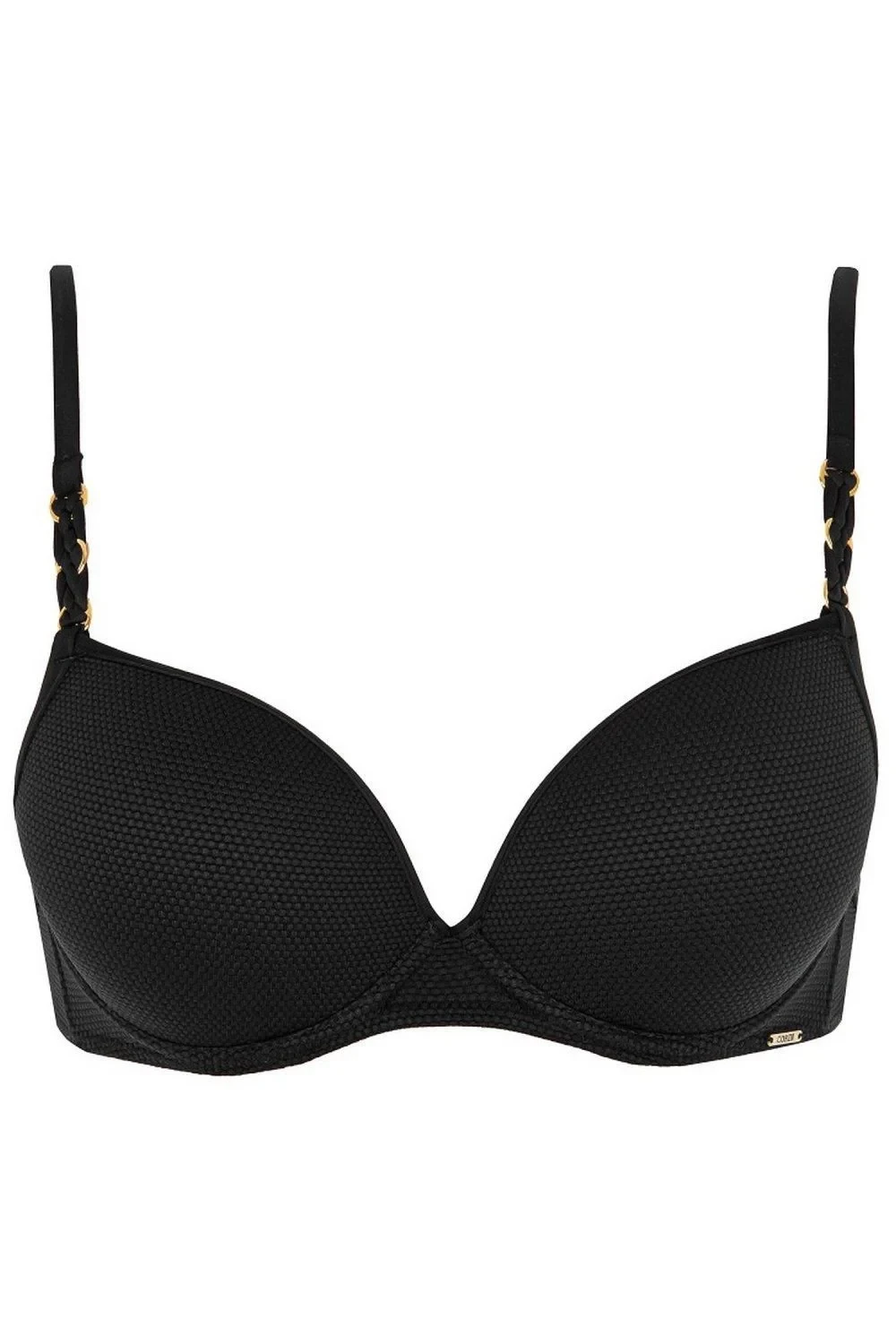 Horní díl plavek 16404 Dallas black CORIN - černá barva - typ push-up - s kosticemi - z materiálu s texturou drobných včelích plástev - ramínka spojená s košíčkem exkluzivní šňůrkou a zlatými kroužky - neodepínatelná a nastavitelná ramínka - černé zapínání vzadu