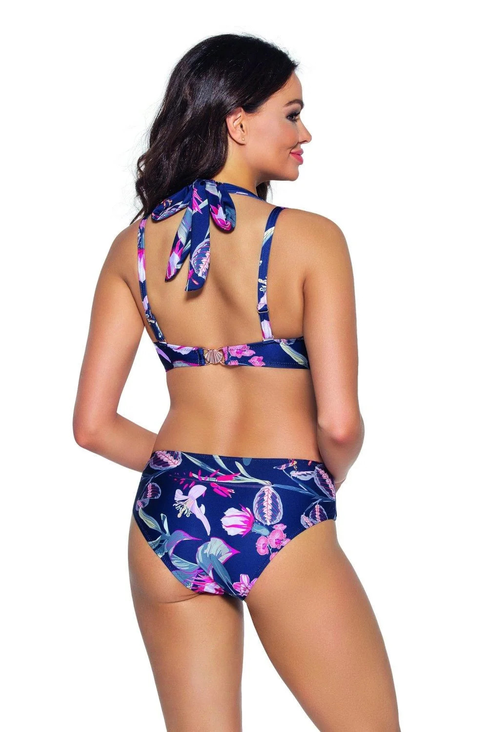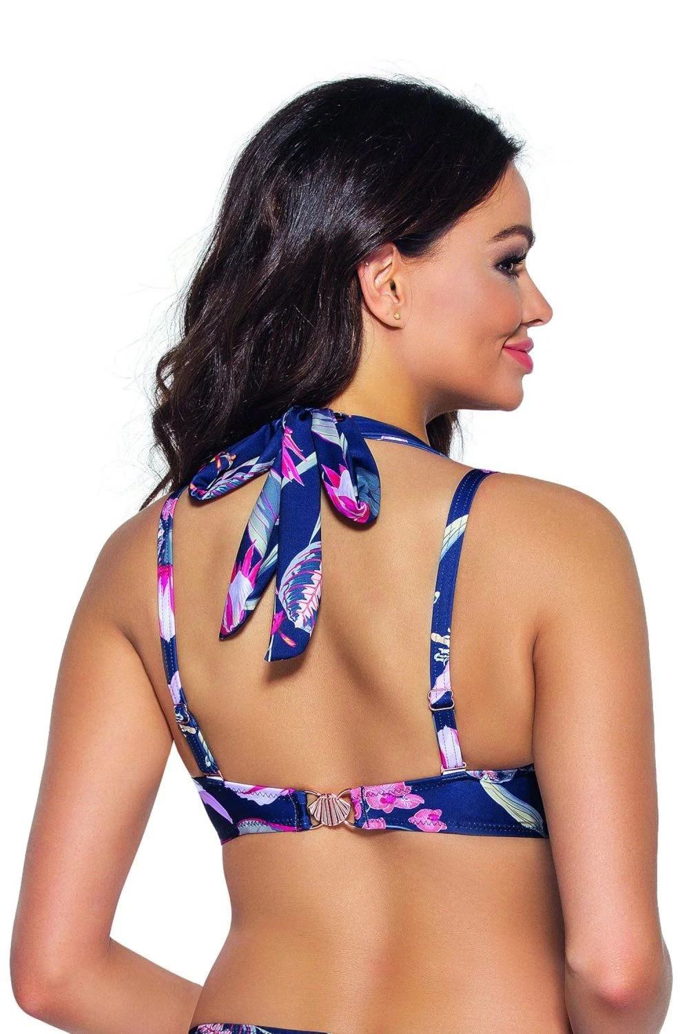 Horní díl plavek 167 Flowers AVA - tmavě modrá barva - z velmi kvalitního mikrovlákna - vyztužené košíčky - s kosticemi - ramínka na zavazování - za krk, vzadu, pod prsy - nastavitelná a odepínatelná ramínka