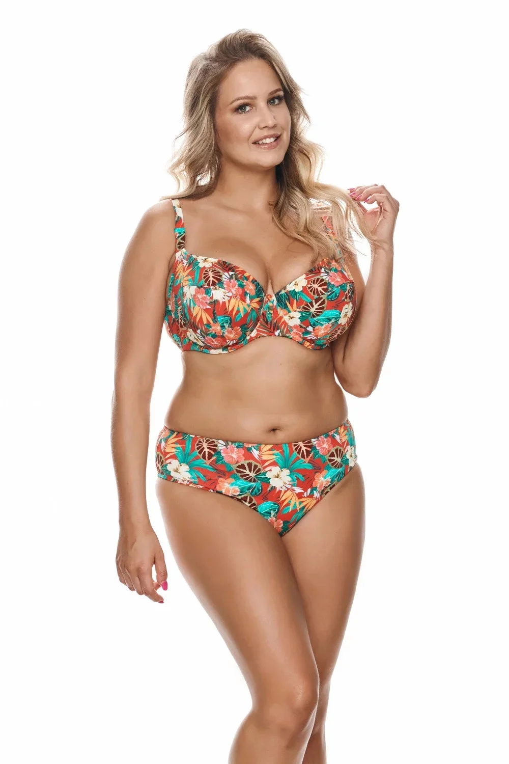 Tato barevná podprsenka s exotickým motivem je ideální volbou pro dámy s plnějšími křivkami. Podprsenka je vyrobena z úpletu, je měkká, má modelující střihy a kostice, dokonale podpírá poprsí. Popruhy jsou nastavitelné, nejsou odnímatelné. Šířka ramínek a typ zapínání jsou přizpůsobeny velikosti plavek.