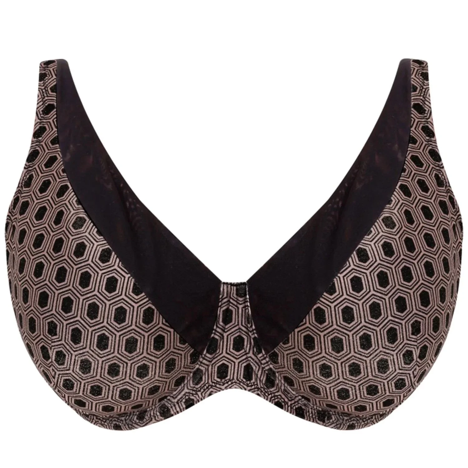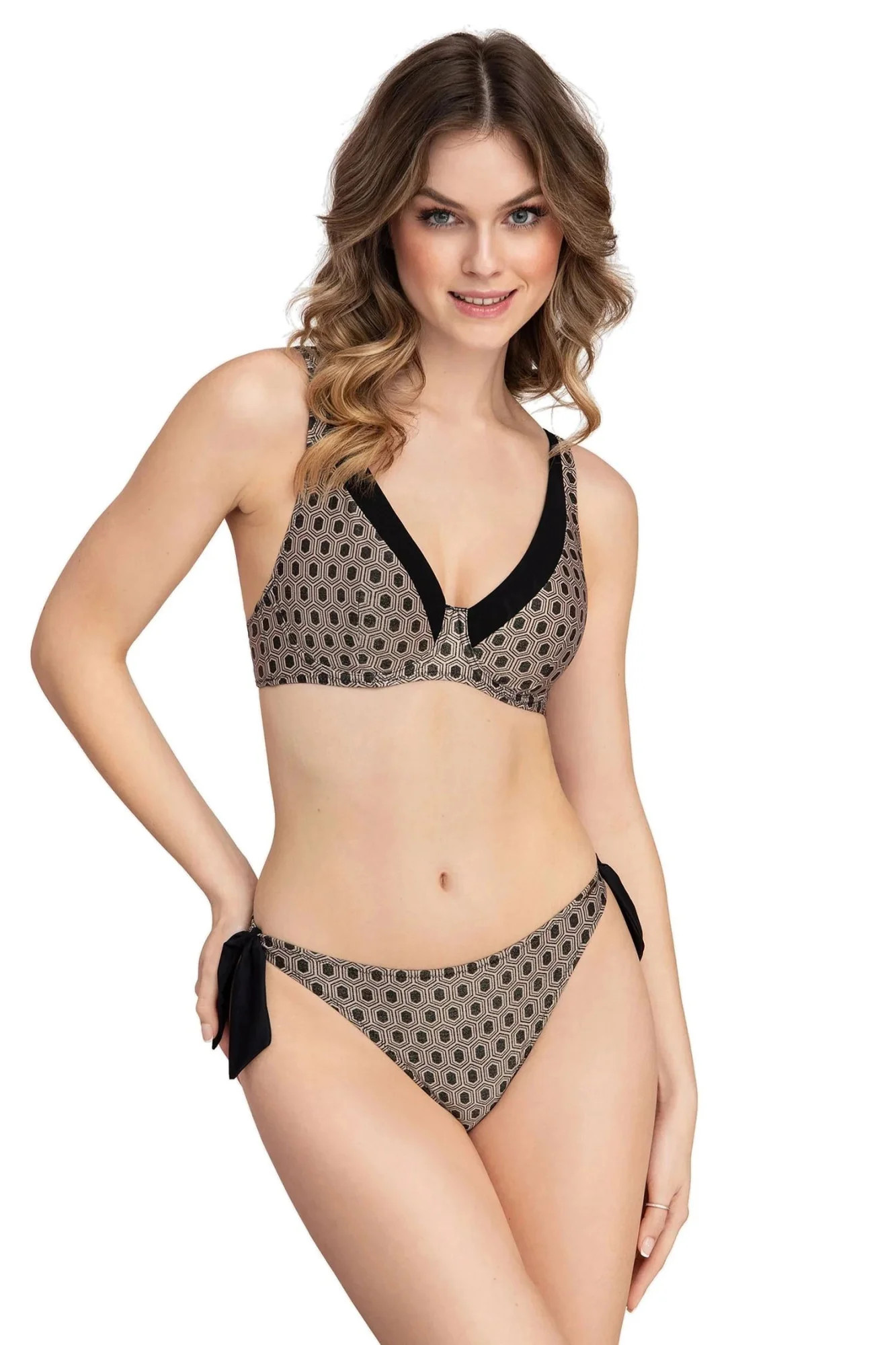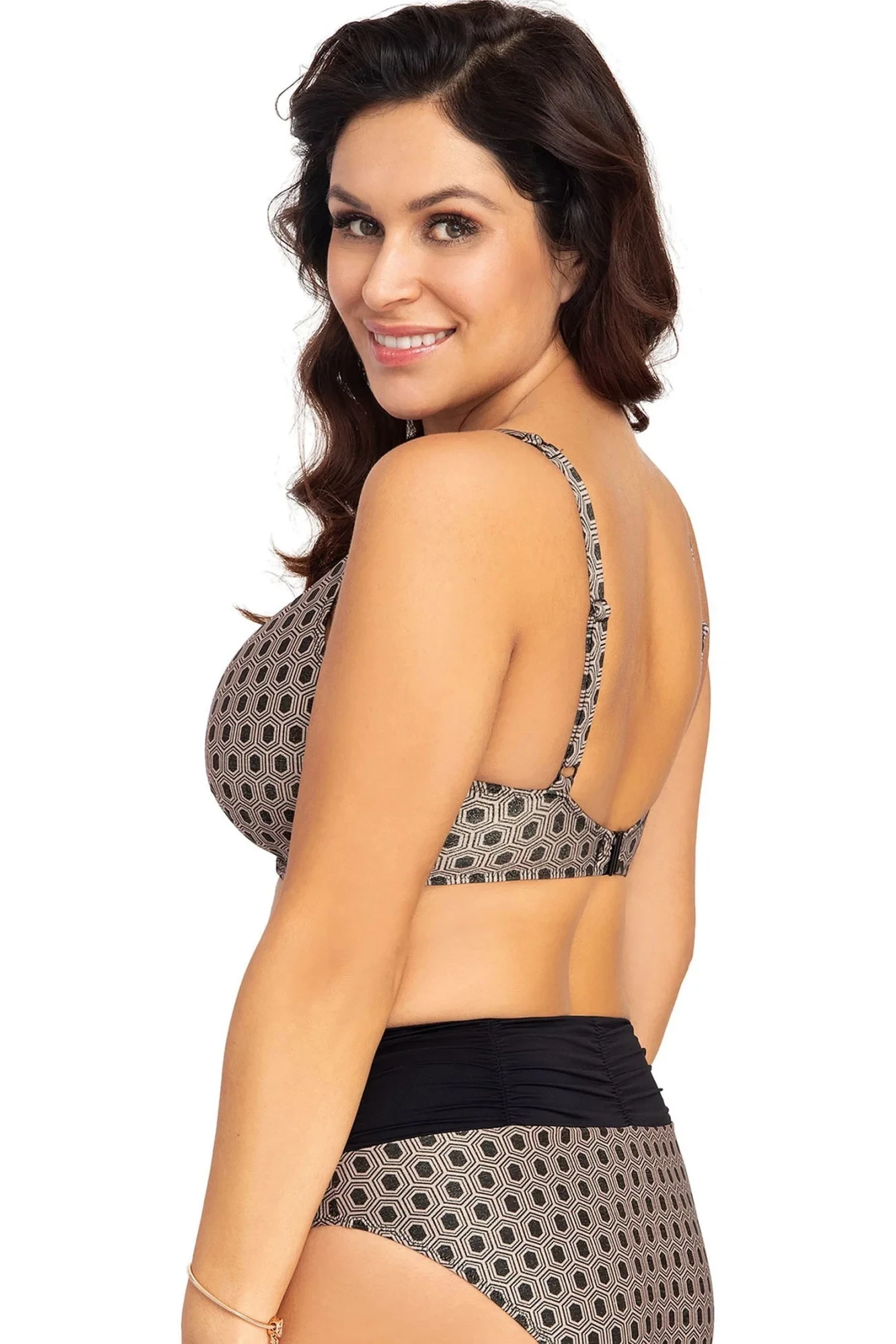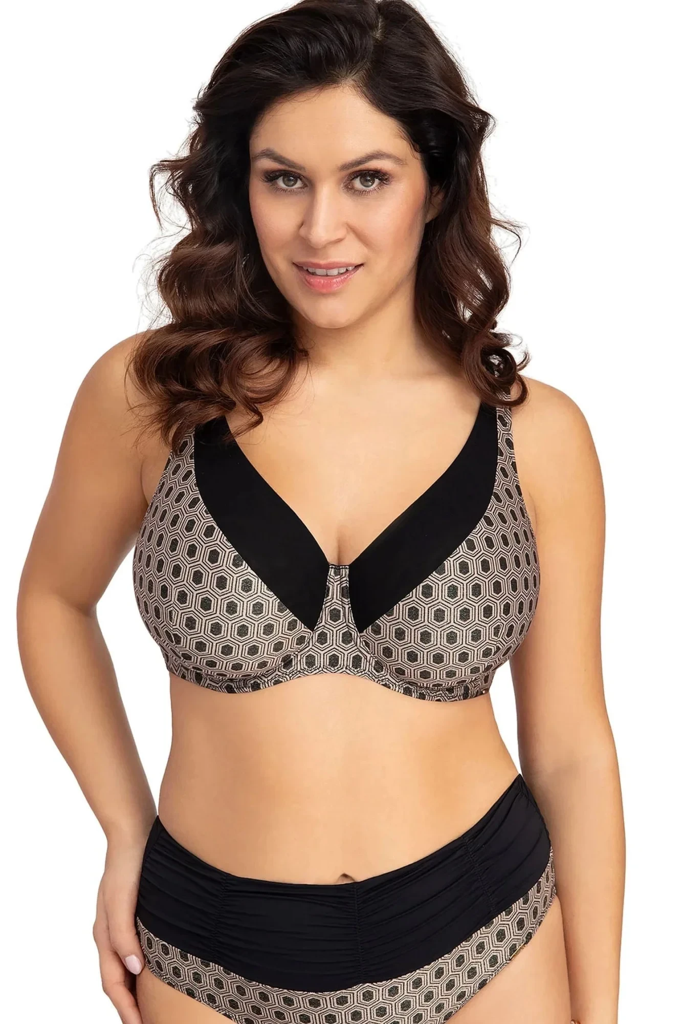 Horní díl plavek 11414 Christina CORIN - černá barva - geometrický vzor za zlatém podkladu - měkké košíčky ve tvaru trojúhelníku - s dráty obepínající poprsí - horní část z dvojité vrstvy černého tylu - ramínka spojená s košíčky - neodepínatelná a posuvná ramínka