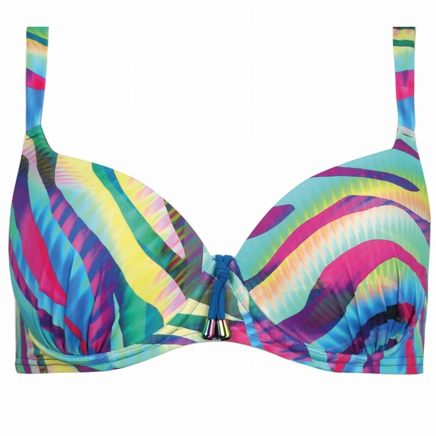 Horní díl plavek 10/881/24 FEBA - světle modrá barva - pestrobarevný vzor - typ push-up - košíčky zdobené volánky - mezi košíčky ozdoba - s kosticemi a boční vyztužená síťovina - nastavitelná ramínka
