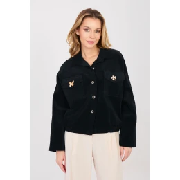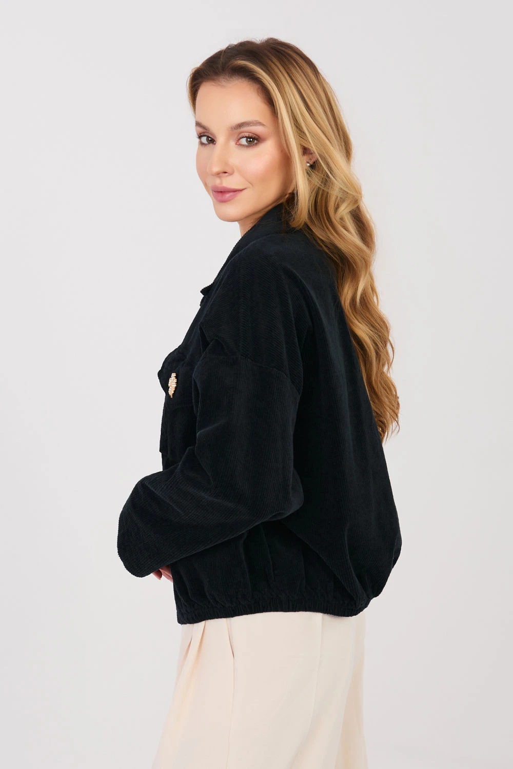 Moderní dámská sametová bunda v casual stylu, ideální na každodenní přechodné dny. Tento model kombinuje klasický střih bomberky s moderním, lehce retro dokončením, vytvářející univerzální návrh pro mnoho outfitů. Bunda je vyrobena z vysoce kvalitní bavlny s přídavkem elastanu, co zajišťuje pohodlí nošení a jemnou pružnost materiálu. Má hladký vzor, krátký střih a dlouhý rukáv, který dodává lehkost a moderní charakter. Praktické kapsy se záložkami vpředu umožňují pohodlné uložení drobností, a zapínání na knoflíky a gumový lem dole zajišťují přizpůsobení a pohodlí nošení. Další výhodou jsou odnímatelné ozdobné brože, které umožňují personalizovat vzhled bundy. Model je dokončen klasickým límečkem, co zdůrazňuje elegantní charakter bomberky, zároveň si zachovává casual styl. Je to ideální volba pro ženy hledající praktickou a stylovou bundu na jaro nebo podzim.