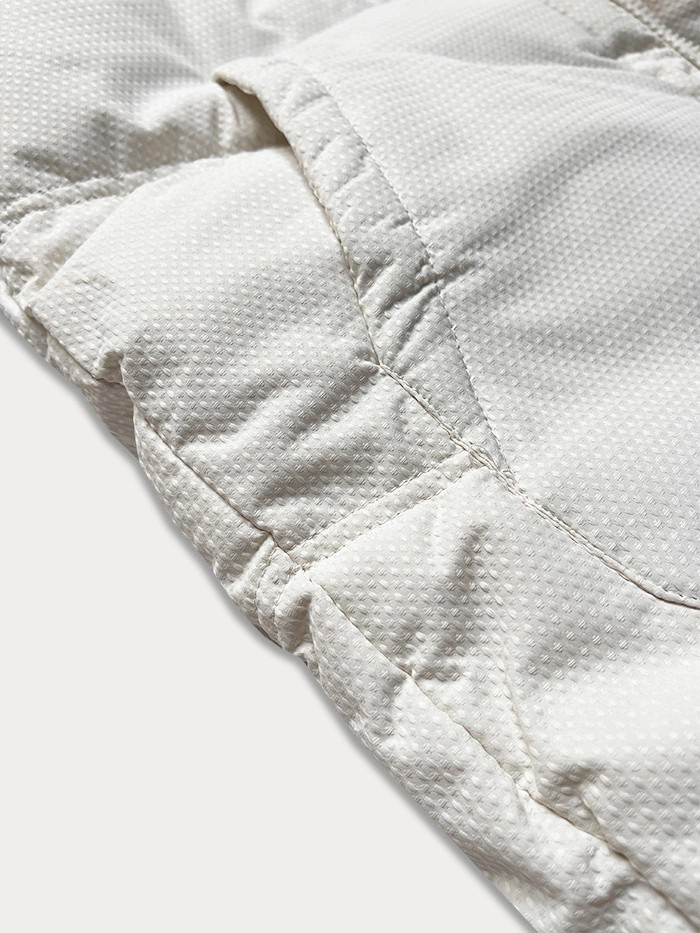 Bunda má volný střih, je zateplená syntetickou péřovou výplní, má dvě kapsy bez zapínání a zapíná se černým zipem. Model má kapuci, kterou není možné odepnout. Na koncích rukávů jsou skryté stahovací lemy. Ve spodní části modelu jsou na bocích stahující gumy. Bunda má délku k bokům.