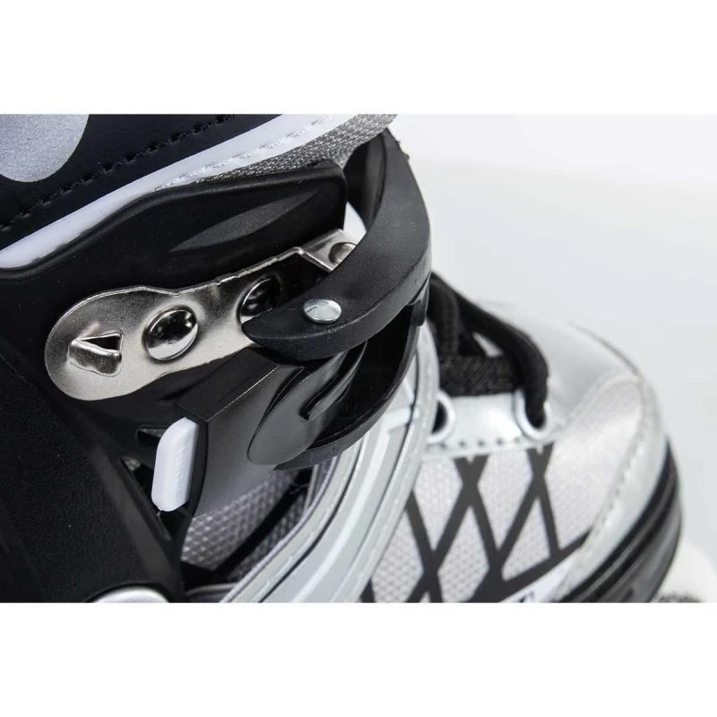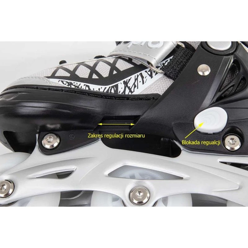 Jsou vybavenylehkou a pevnou hliníkovou skluznicí, brzdou, mléčnými kolečky o průměru 64 mm s bílýmiLED světly, třemi nastavitelnými úchyty a možností nastavení velikosti. Kolečka a ložiska ABEC7 umožňují nižší valivý odpor a lze je používat na dlouhé vzdálenosti i při rekreační jízdě. Zpevněný svršek s voděodolnou vrstvou, široký pohodlný střih a měkké polstrování kolem kotníku zvyšují komfort používání při jízdě. Brusle jsou vyrobeny z odolného kovu odolného proti poškození a korozi.