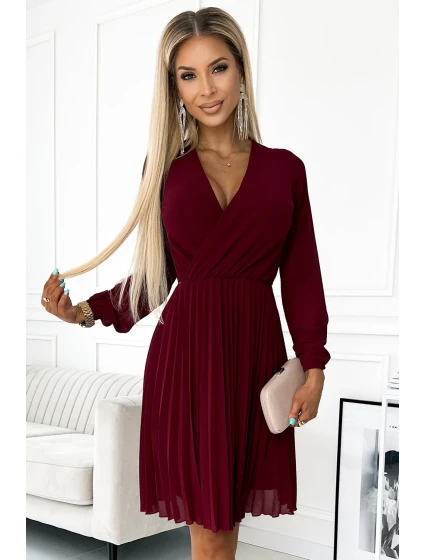 ISABELLE Dámské plisované šaty ve vínové bordó barvě s dlouhými rukávy a výstřihem model 20494287 - numoco