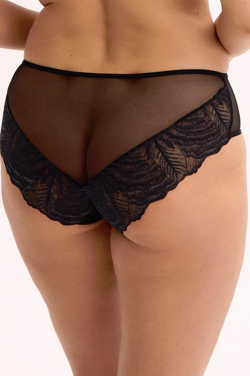 Isla 1228 lace bikini bottom in deep black is a unique combination of sensual design and everyday comfort. The back made of transparent tulle subtly reveals the skin, emphasizing the feminine curves in an elegant way. The front is decorated with striking lace with a floral motif, which harmoniously combines with the smooth mesh. Delicate trims and flat seams ensure comfort and invisibility under clothing. An ideal choice both for a set with the Isla bra and as a separate item of clothing.