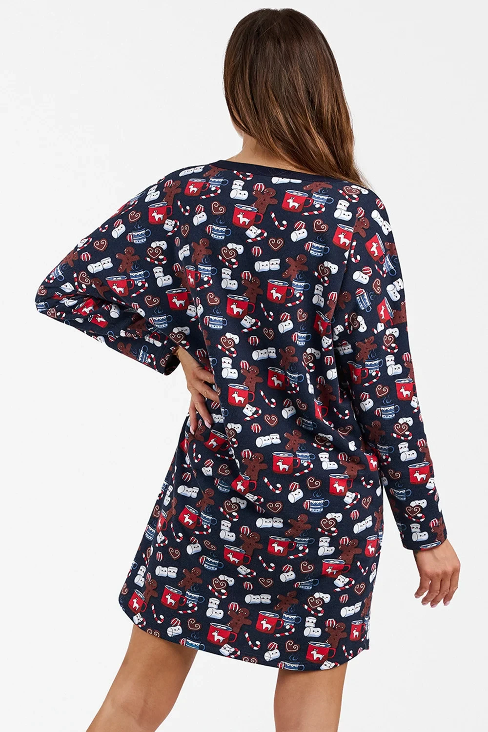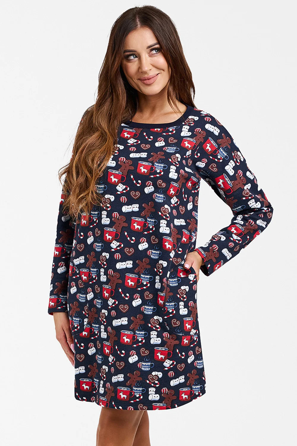 Noční košile značky Italian Fashion. model Cookies long. výrobek je vyroben ze 100% bavlny. má kapsy. délka rukávu: dlouhý rukáv. délka: mini. dámský výrobek. typ výstřihu: kulatý.