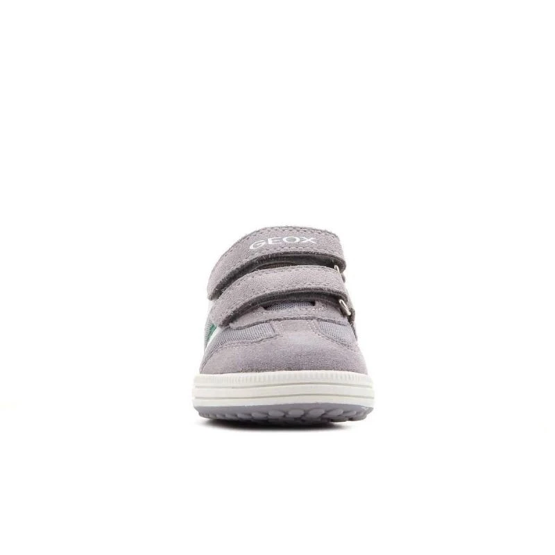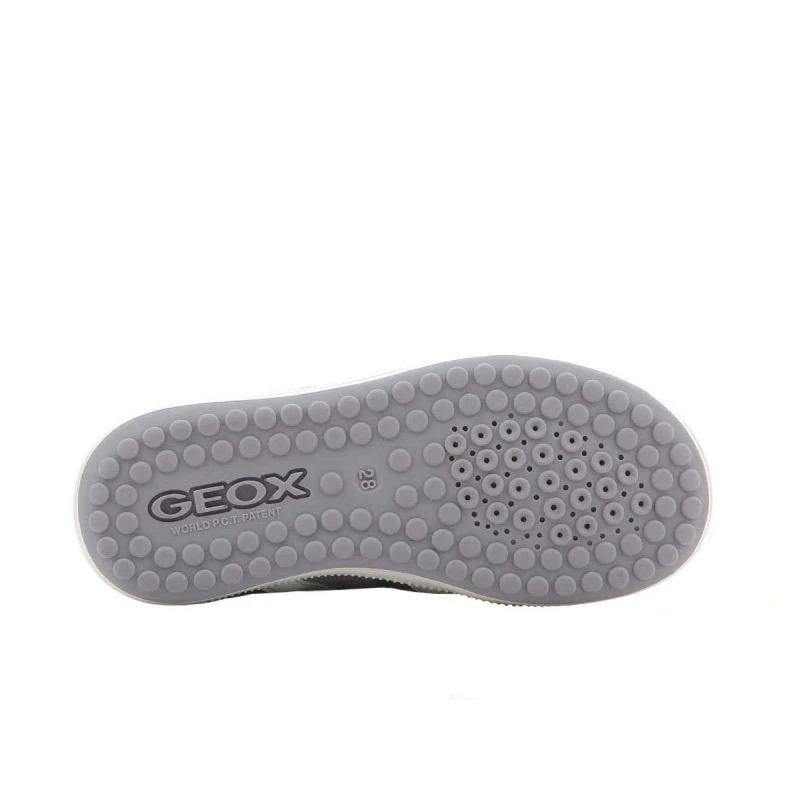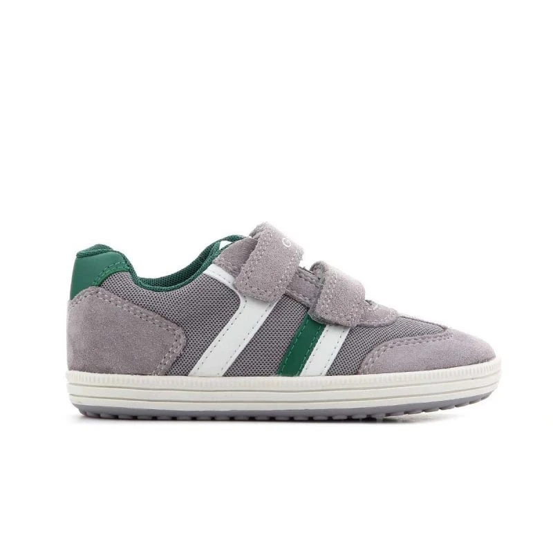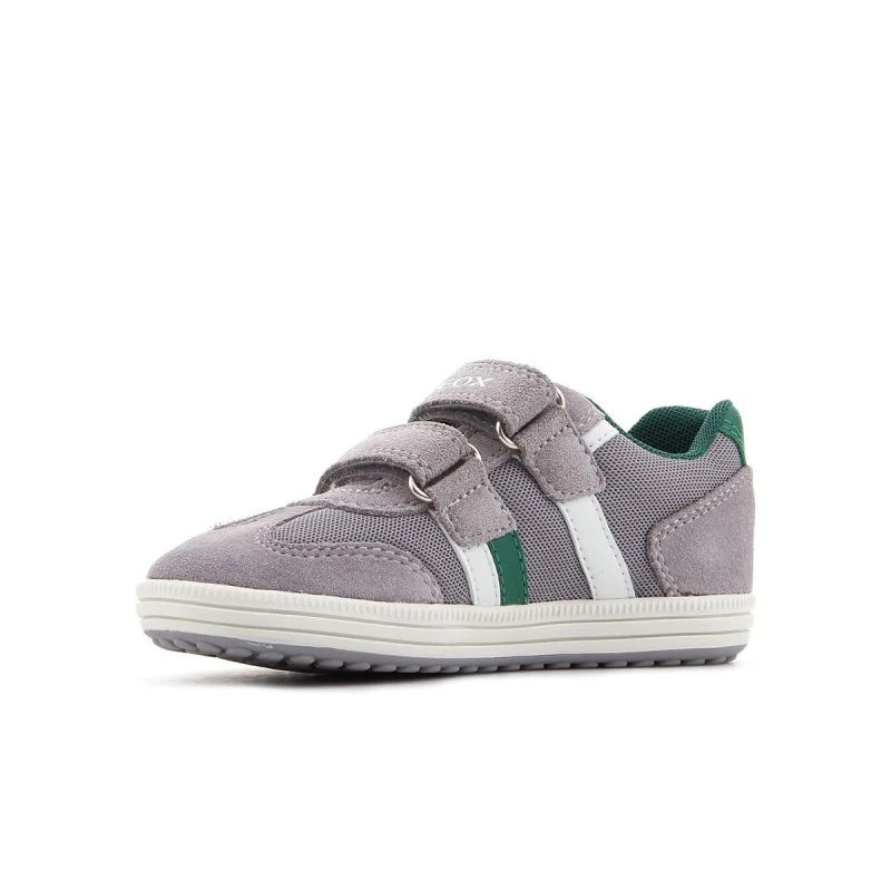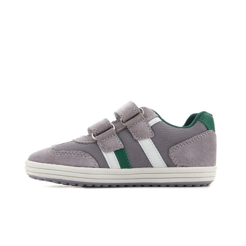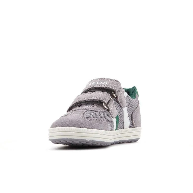 Dětská obuv značky Geox se svrškem z kombinace semišové kůže a textilního materiálu, popelavě zelenými a bílými vložkami, antibakteriální koženou stélkou a kvalitní syntetickou podrážkou. Obuv je navržena tak, aby vyhovovala potřebám rostoucích nohou. Geox Respira je perforovaná podrážka, která absorbuje a odvádí pot, aniž by propouštěla vodu do boty, a udržuje tak nohu v suchu a správné teplotě.