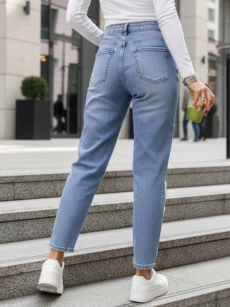 - Krój mom fit - zapewnia wygodę i swobodę noszenia przez cały dzień