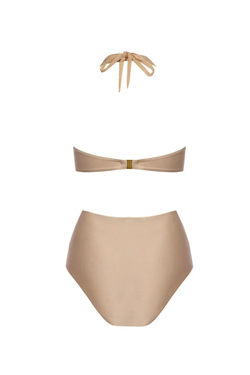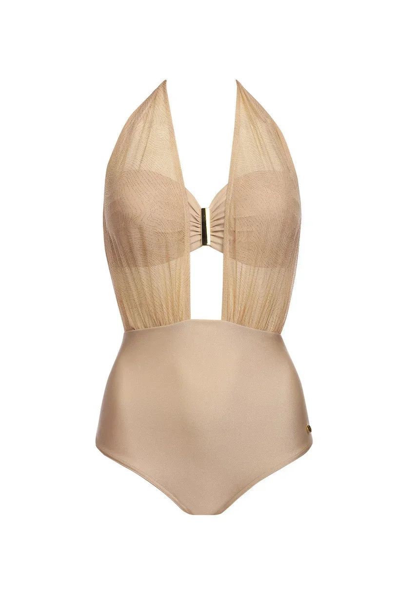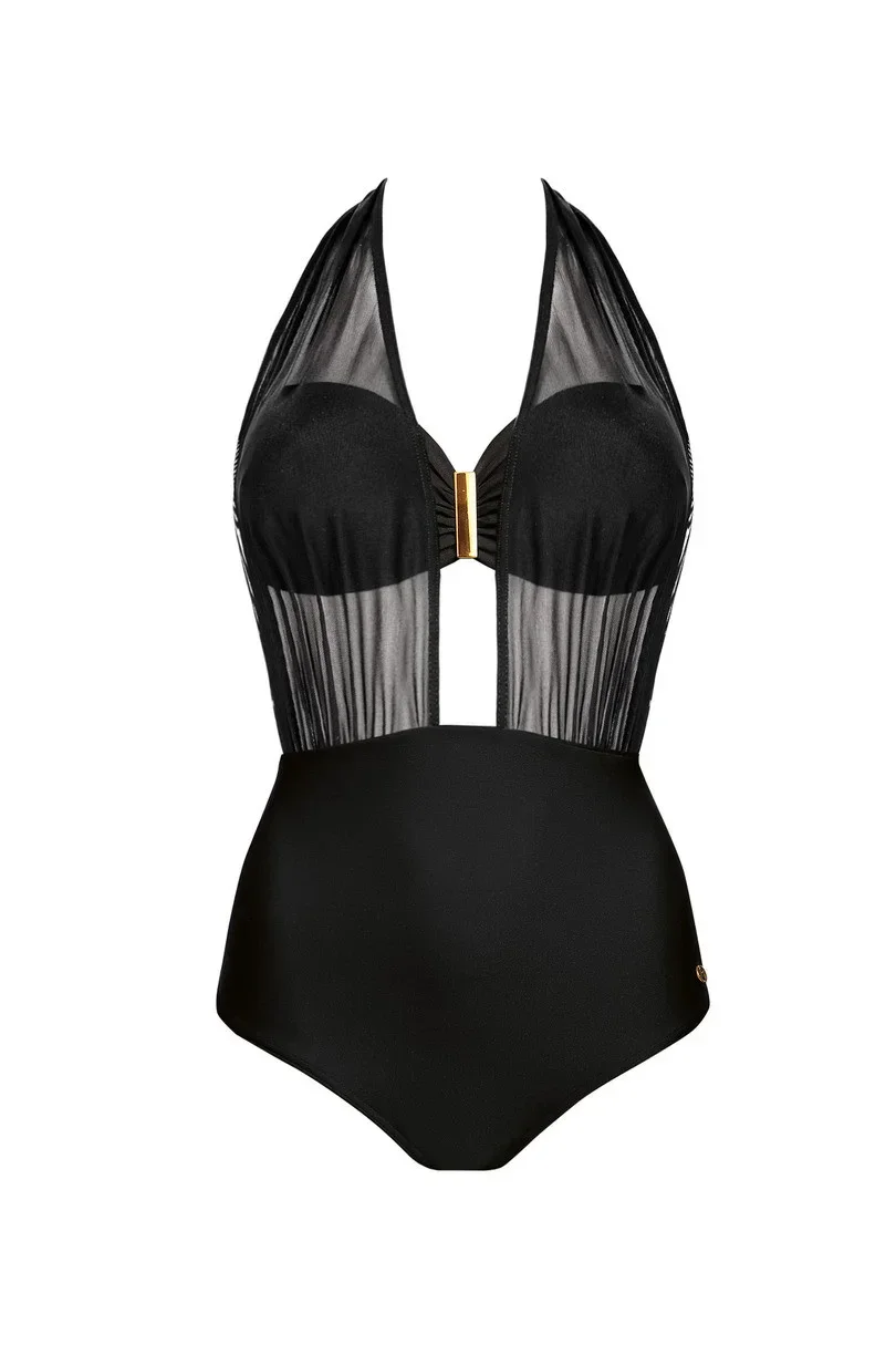 Výjimečně elegantní jednodílné plavky z řady SECRET. Je vyrobena z vysoce kvalitního lesklého mikrovlákna s přídavkem lycry. Vyztužená podprsenka typu bardot s kosticemi a push-up vsadkami na košíčcích, spojená sponou. Zapíná se na zádech, ramínka jsou nastavitelná a odnímatelná. Spodní část plavek je hladká, na košíčcích je našitý tyl, který se zavazuje za krkem