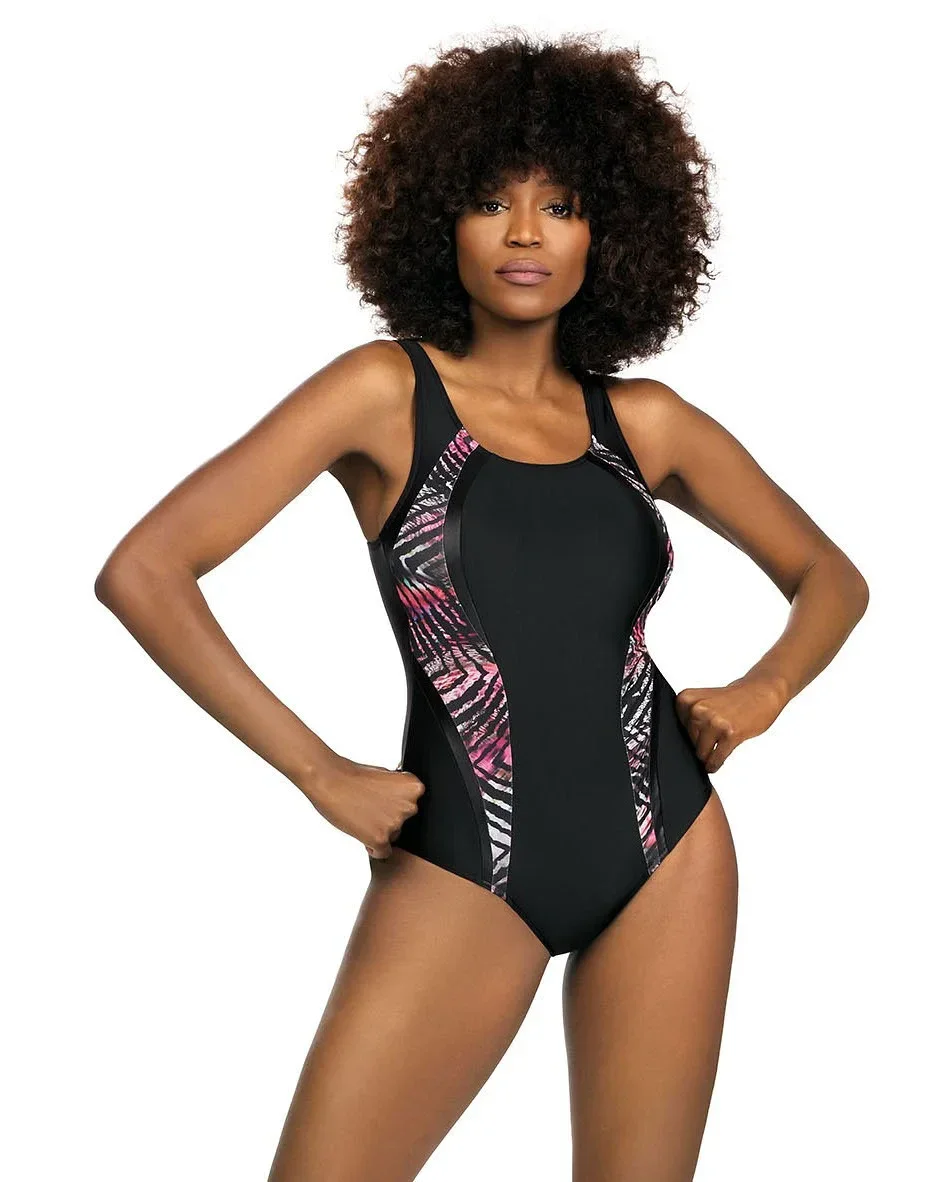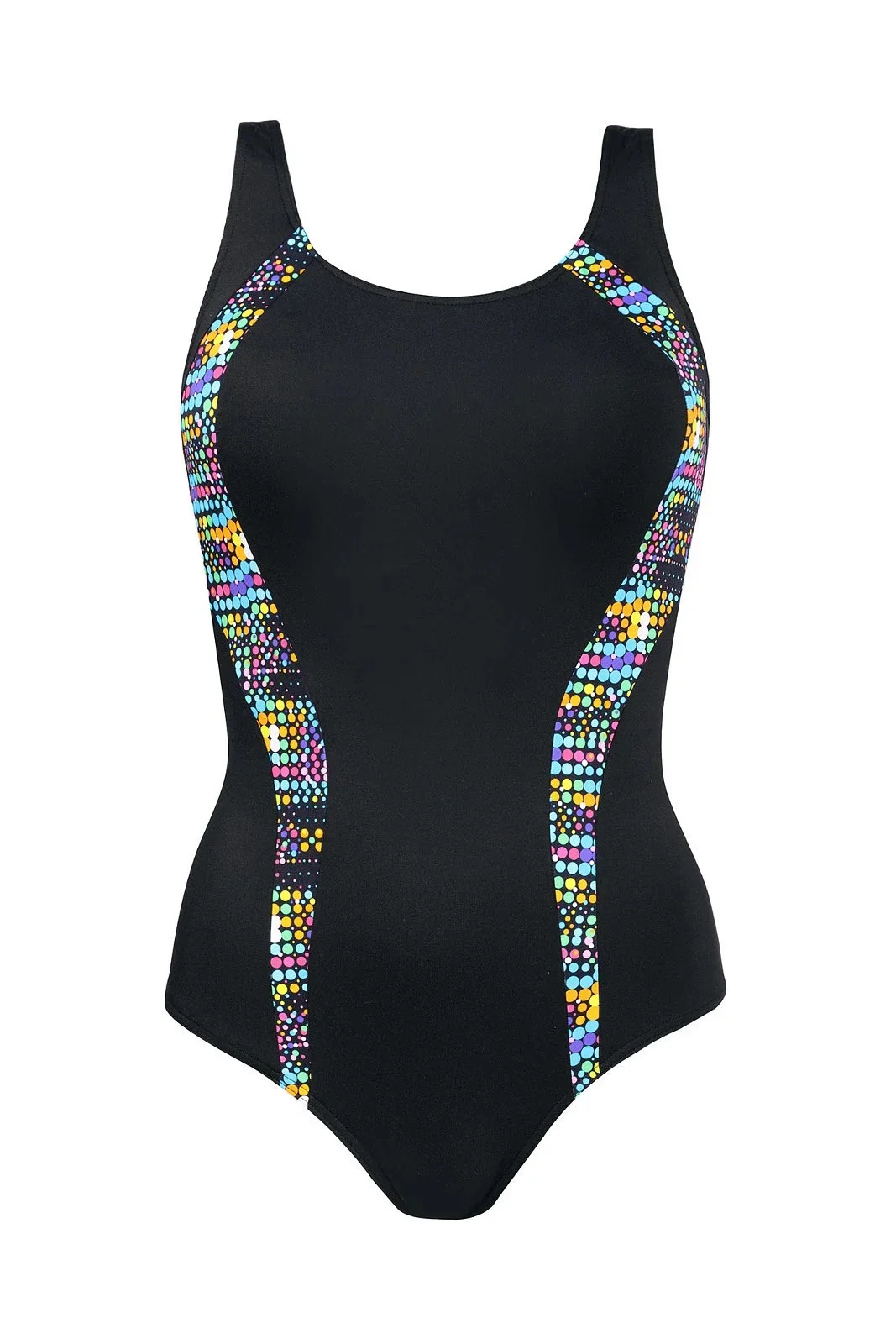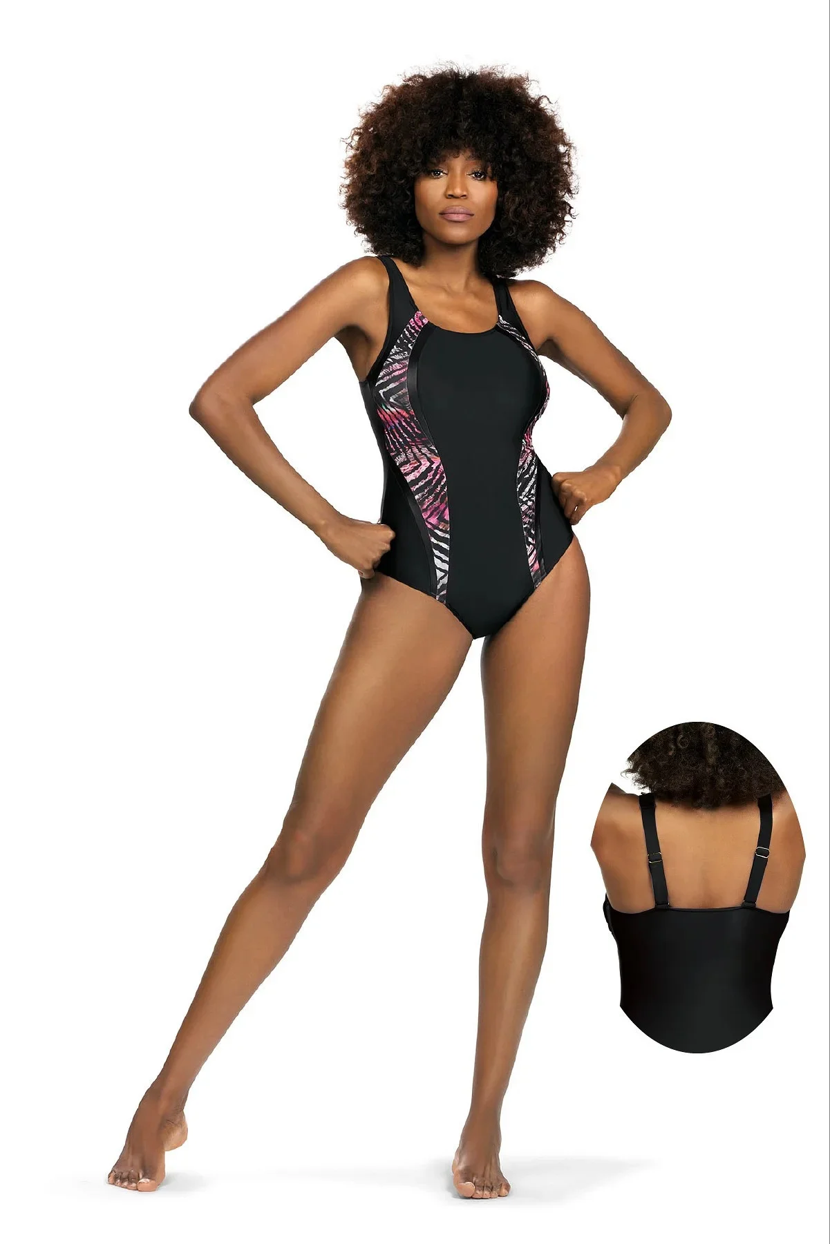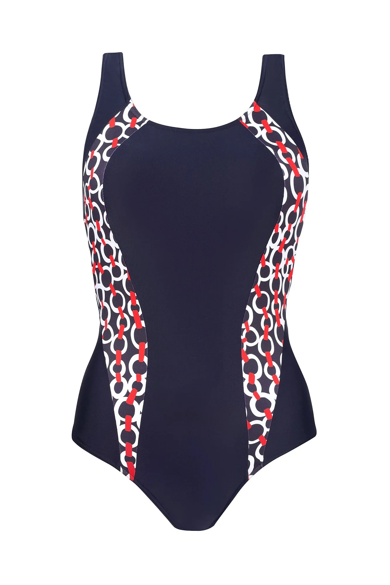 Plavky jsou ozdobené vsadkami v kontrastní barvě. Na vnitřní straně modelu jsou vyztužené košíčky. Délku širokých ramínek je možné nastavit.