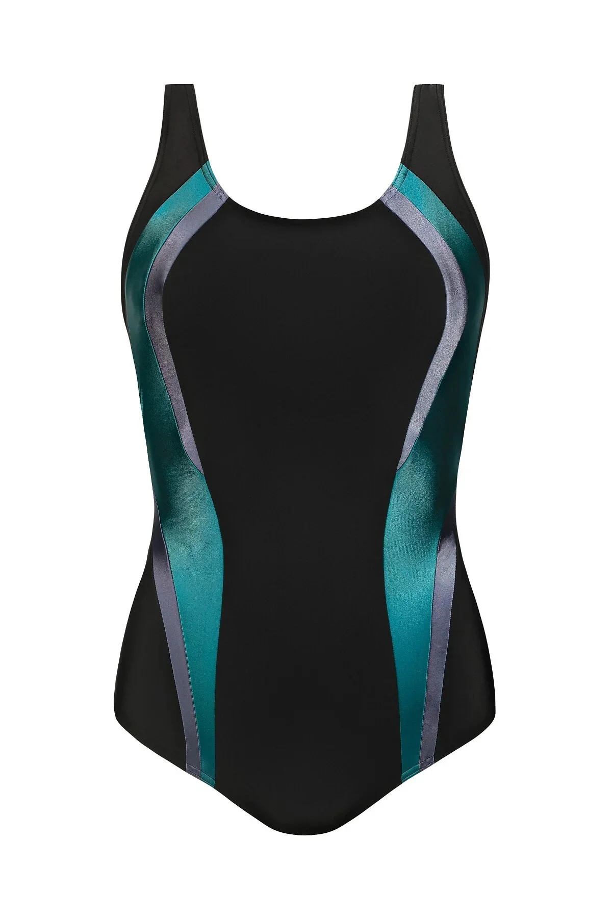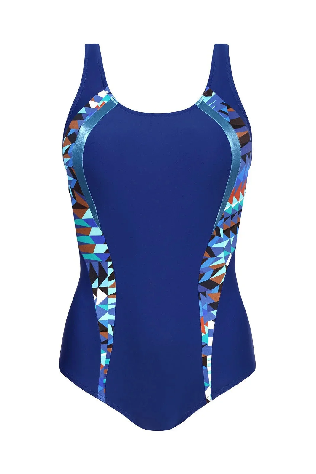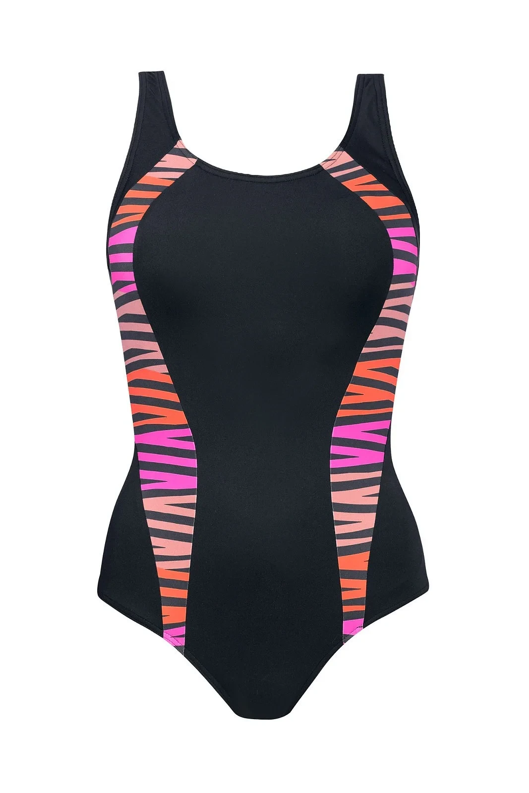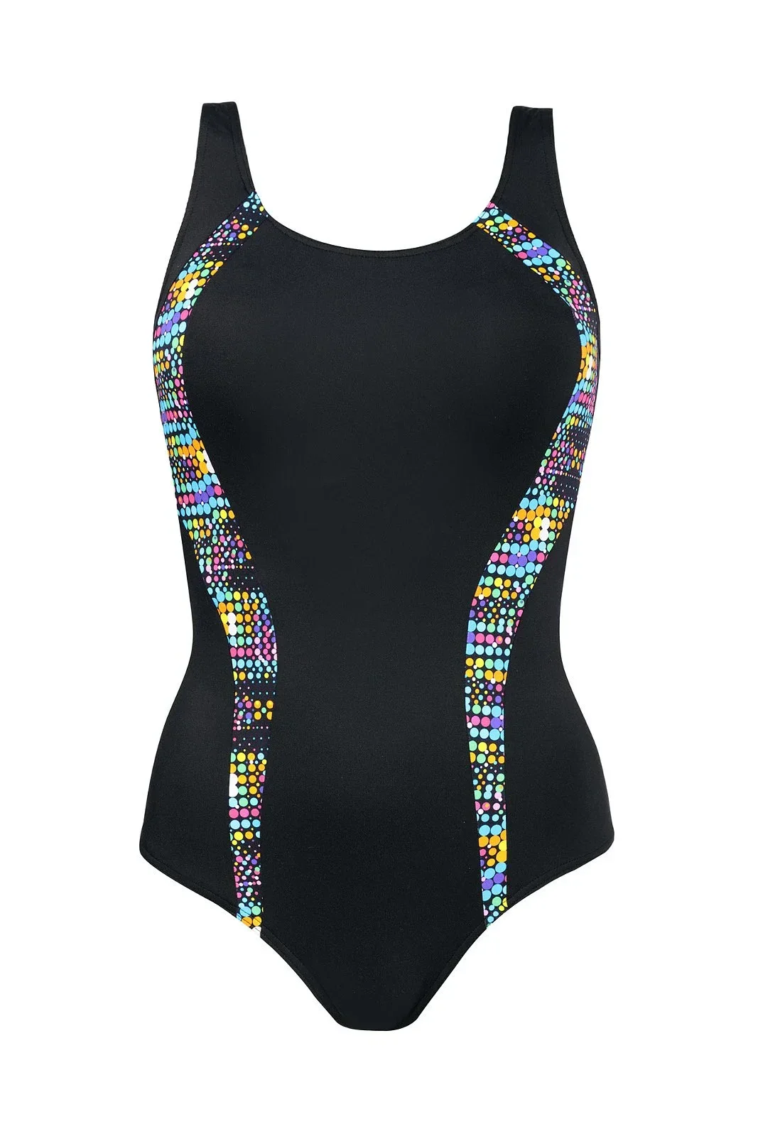 Plavky jsou ozdobené vsadkami v kontrastní barvě. Na vnitřní straně modelu jsou vyztužené košíčky. Délku širokých ramínek je možné nastavit.