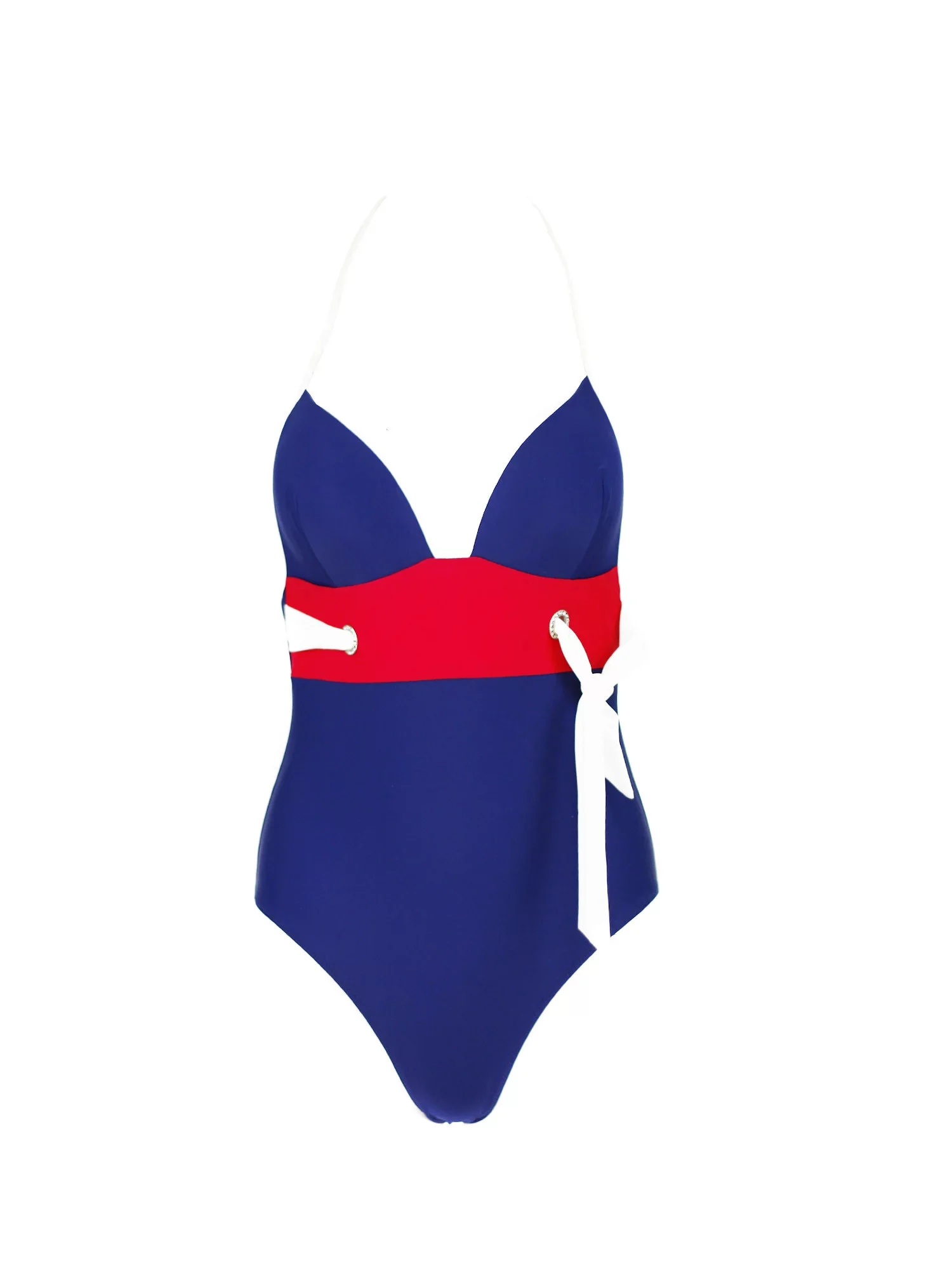 Jednodílné italské dámské plavky modro-červeno-bílé, se štrausovými kamínky, košíčky vyztužené, bez kostic, zavazování za krkem.