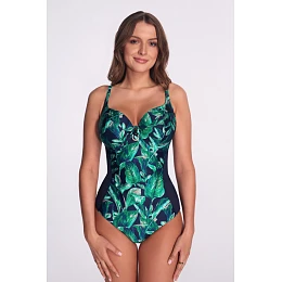 Jednodílné plavky SKJ 66 Leafine značky AVA Swimwear jsou určeny ženám, které hledají eleganci, pohodlí a dokonalé tvarování postavy. Tropický potisk v odstínech zelené na tmavě modrém pozadí přitahuje pozornost a dokonale se hodí k letnímu opálení, zatímco pevné boční díly opticky zeštíhlují pas a boky.