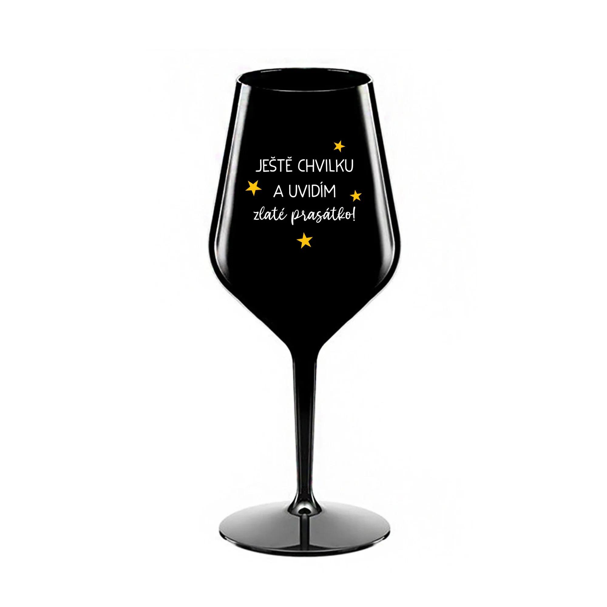 JEŠTĚ CHVILKU A UVIDÍM ZLATÉ PRASÁTKO - černá nerozbitná sklenice na víno 470 ml