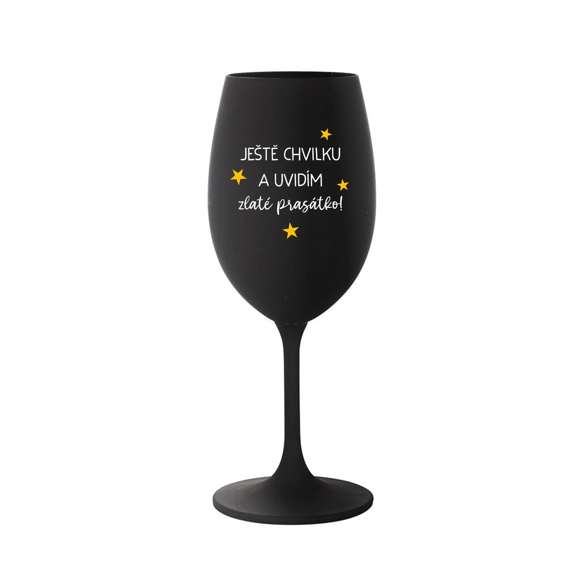 JEŠTĚ CHVILKU A UVIDÍM ZLATÉ PRASÁTKO - černá sklenice na víno 350 ml