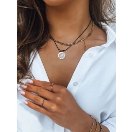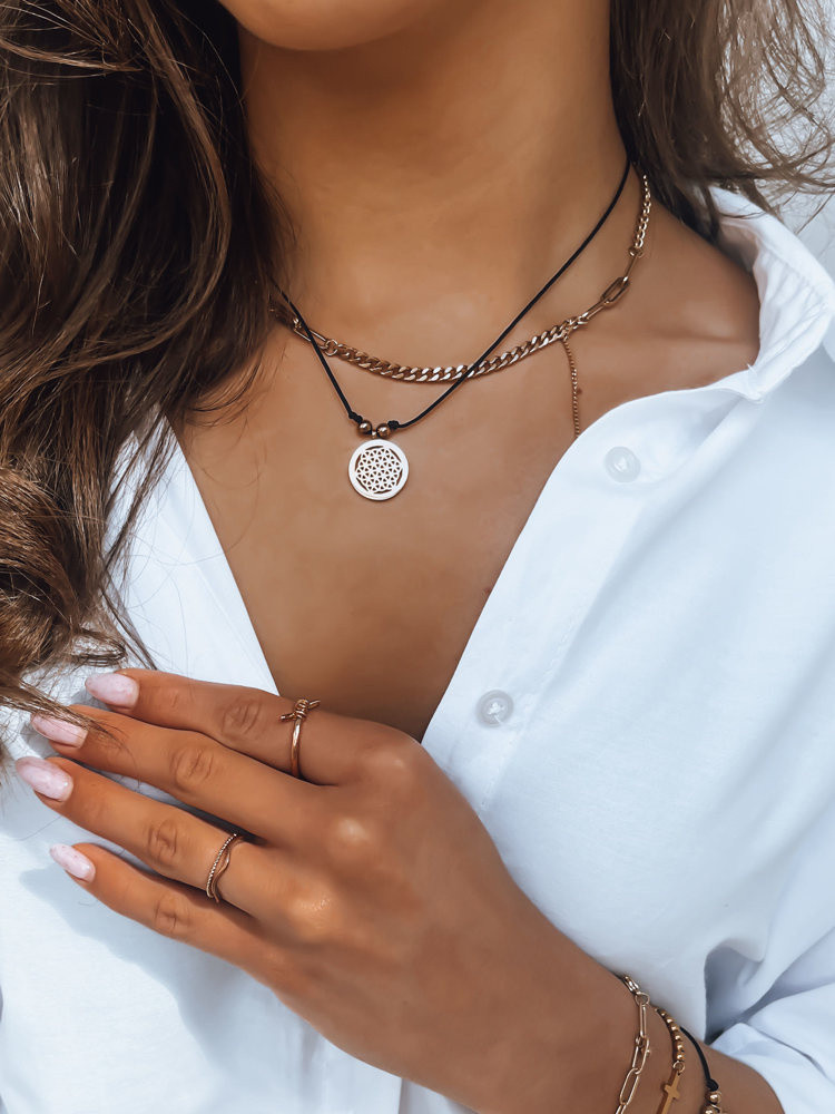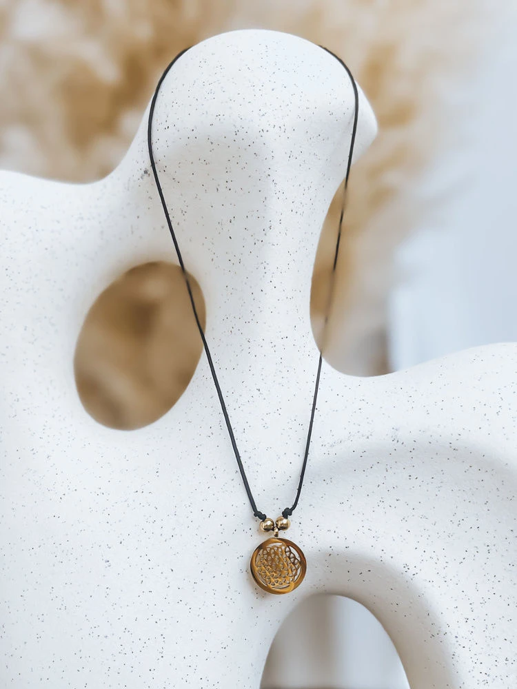 Náhrdelník JIMBIRIN je návrh, který bude vypadat skvěle jako doplněk k mnoha outfitům. Na černé šňůrce je ozdobný přívěsek zlaté barvy a zapínání je nastavitelné.