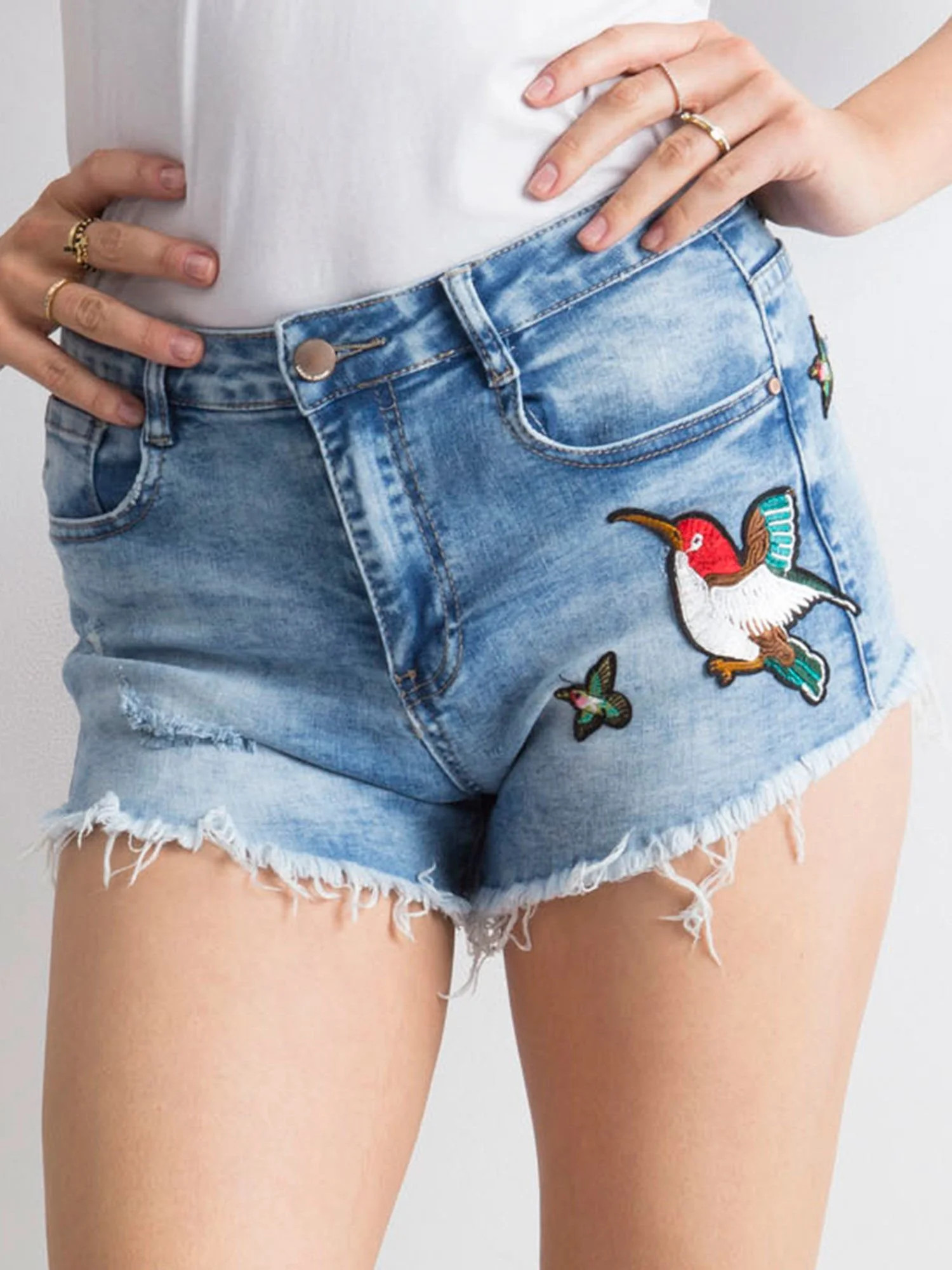 Džínové šortky v modré barvě se záplatami.