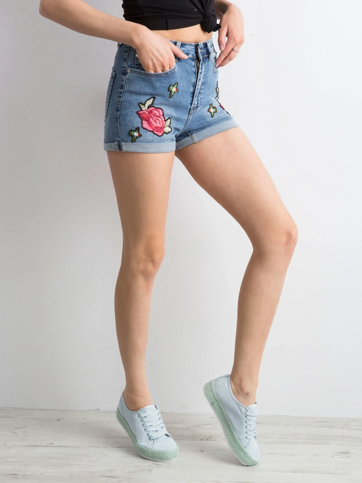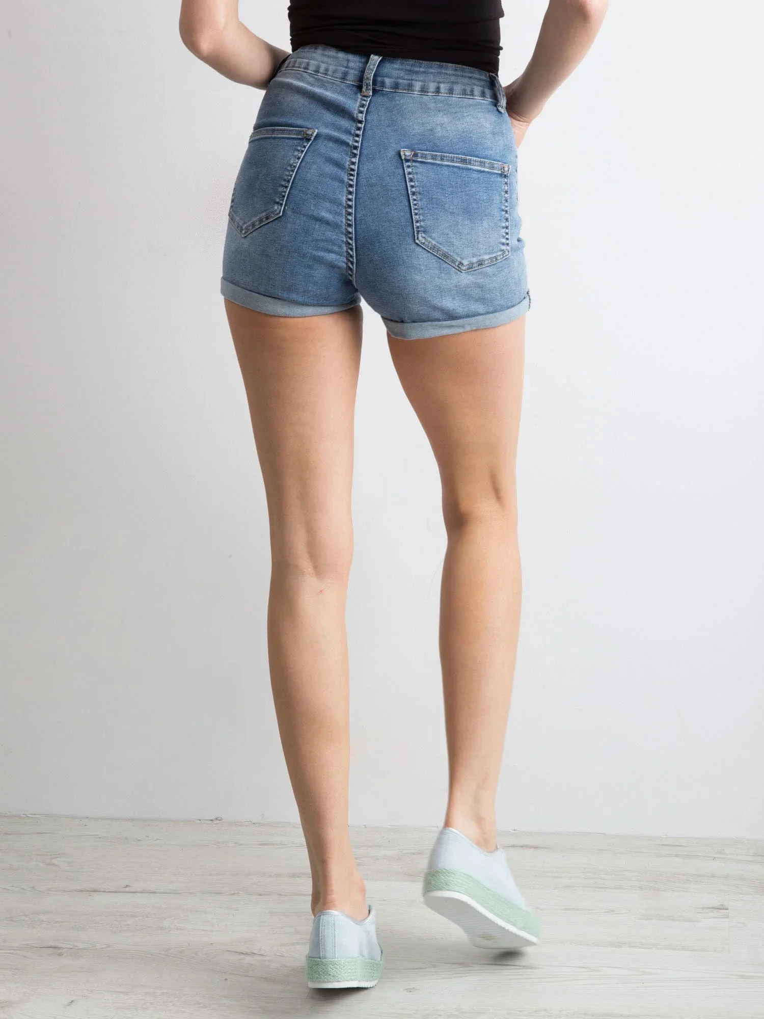 Modré džínové šortky se záplatami.