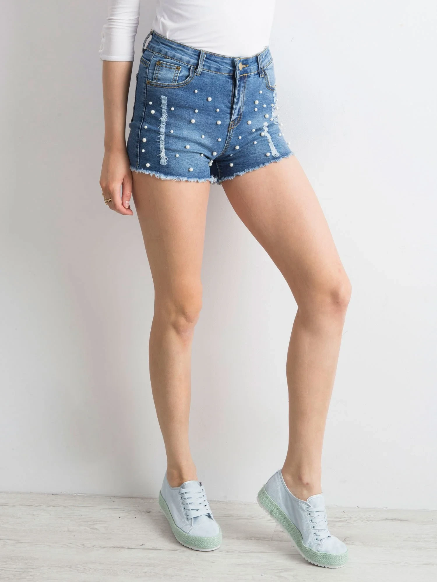 Džínové modré šortky s roztrhanými nohavicemi a perlami.