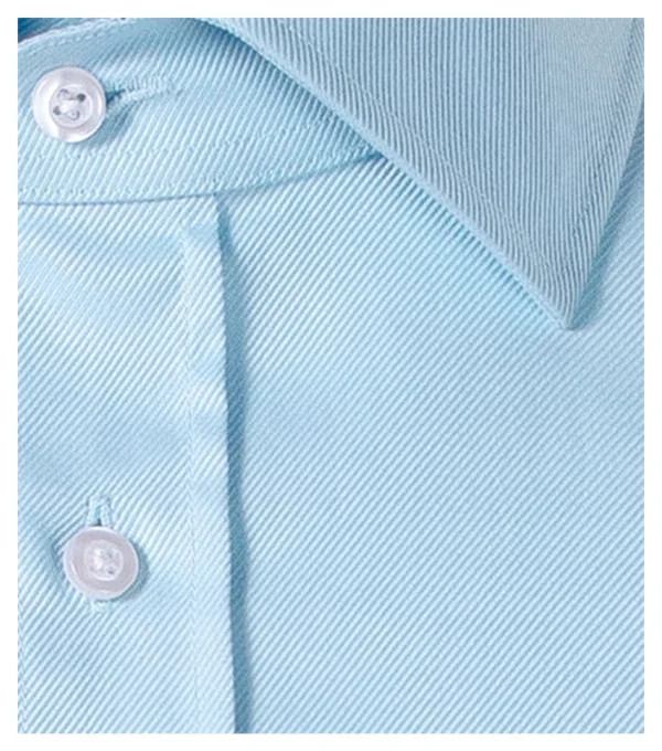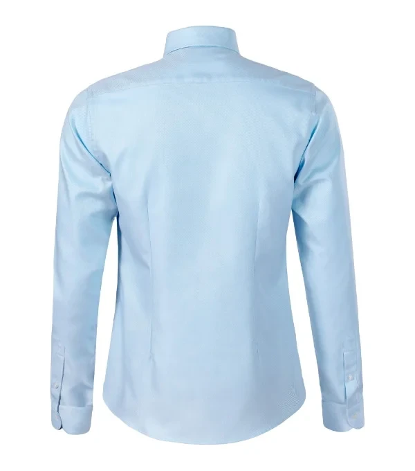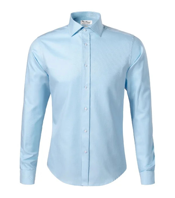 navrženo předním českým krejčím Romanem Humlíčkem příze z extra dlouhých vláken zúžený střih s bočními švy dvojité sedlo a záševky na zadním dílu dvoudílný košilový límec vyztužené špičky límce přední kraje začištěny légou dlouhé rukávy s kulatou manžetou na 2 knoflíčky perleťové knoflíčky v barvě 00 (2 náhradní navíc) tvarovaný dolní kraj