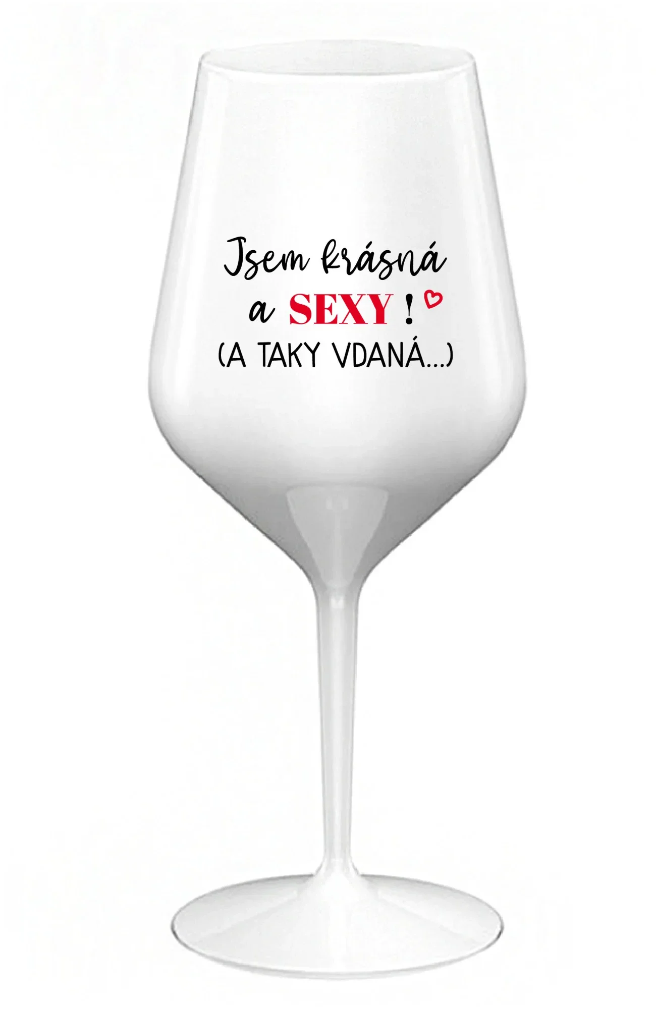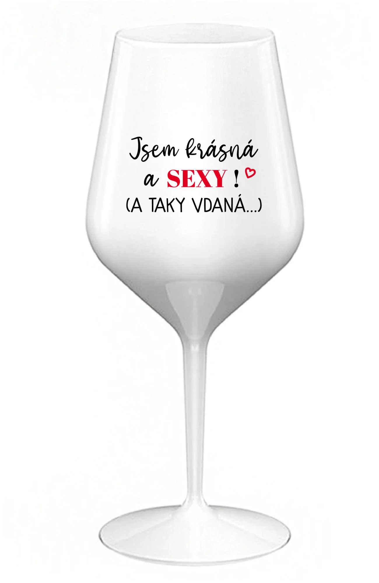 JSEM KRÁSNÁ A SEXY! (A TAKY VDANÁ...) - bílá nerozbitná sklenice na víno 470 ml