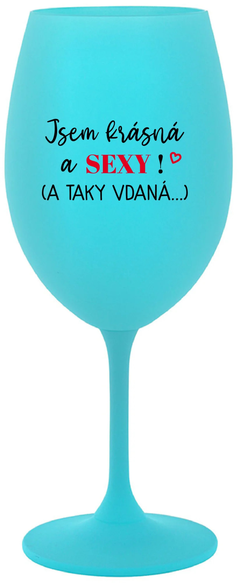 Vinná tyrkysová sklenice s originálním motivem JSEM KRÁSNÁ A SEXY! (A TAKY VDANÁ...) je krásným a osobitým dárkem, které ale využijete i Vy sami třeba ve chvílích, kdy si budete chtít zpříjemnit náročný den. Tyto originální vinné sklenice jsou totiž nejen pro výjimečné události, ale i pro běžné večery, které si chcete zpříjemnit sklenkou dobrého vína. Jistě proto potěší každého milovníka vína, i toho, kdo si umí svůj život vychutnat plnými doušky.