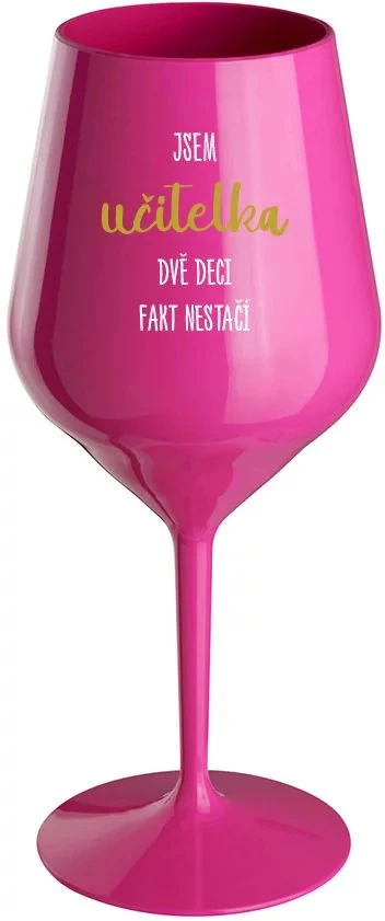 Nerozbitná růžová vinná sklenice s motivem JSEM UČITELKA, DVĚ DECI FAKT NESTAČÍ je skvělá na zahradu, pláž, výlet, piknik a parádu udělá i při kempování. Jelikož je vyrobená z kvalitního polykarbonátu je de facto nerozbitná. Je to luxusní kousek, s nímž si víno můžete vychutnat prostě kdekoliv. Mají ergonomický tvar, který příjemně padne do ruky a protože je lehká, usnadňuje to její přenášení. Je snadno skladovatelná a lehce se čistí. Díky svému designu si s ní můžete vychutnat doopravdy kdekoliv bezproblémové pití výborného vína.