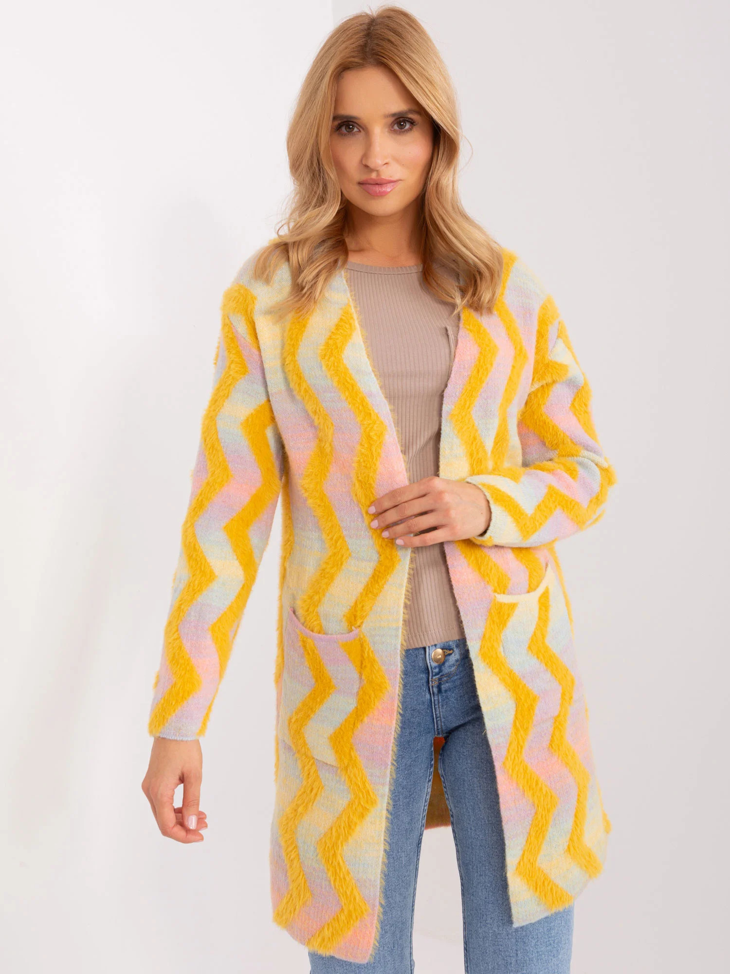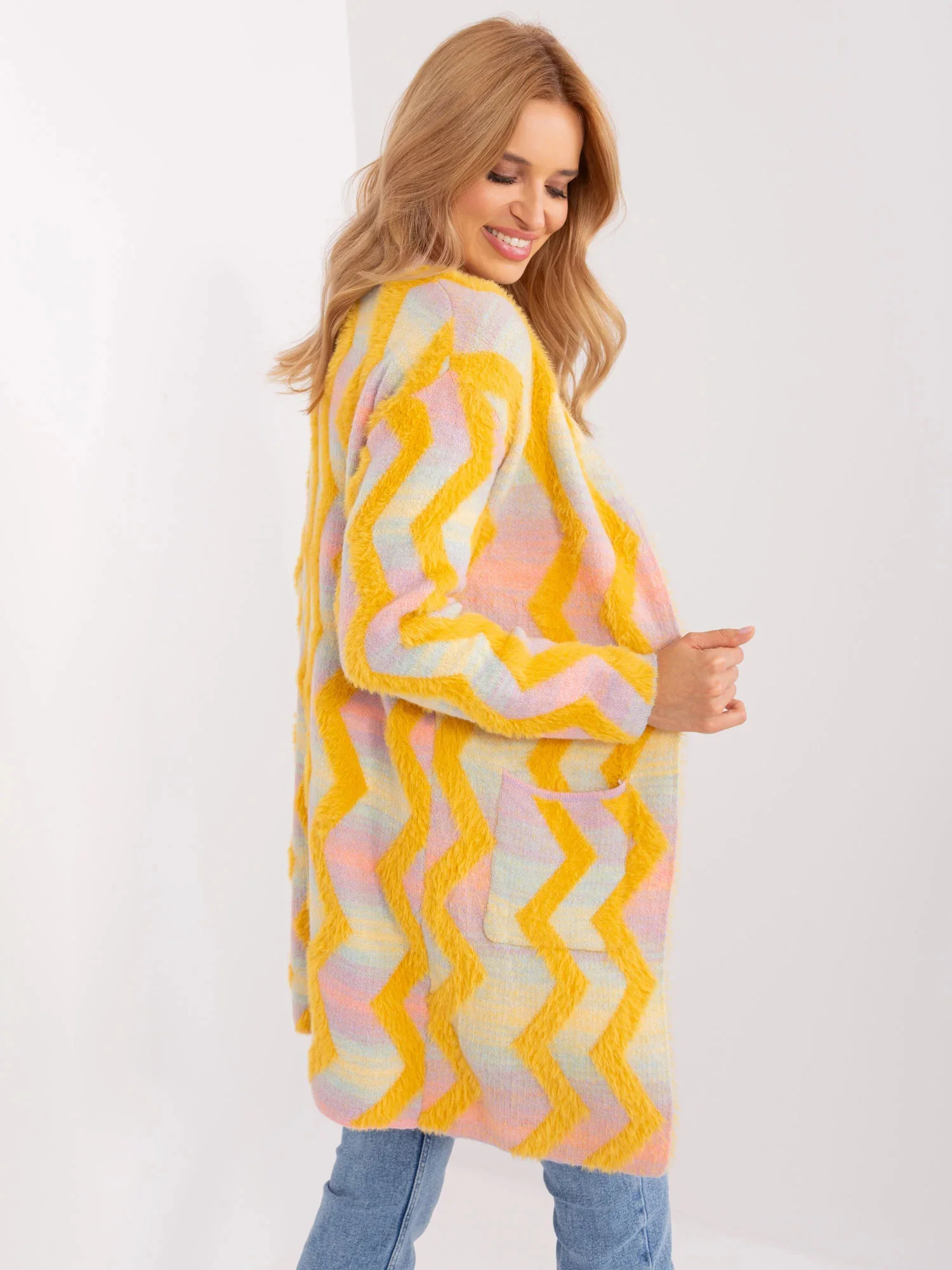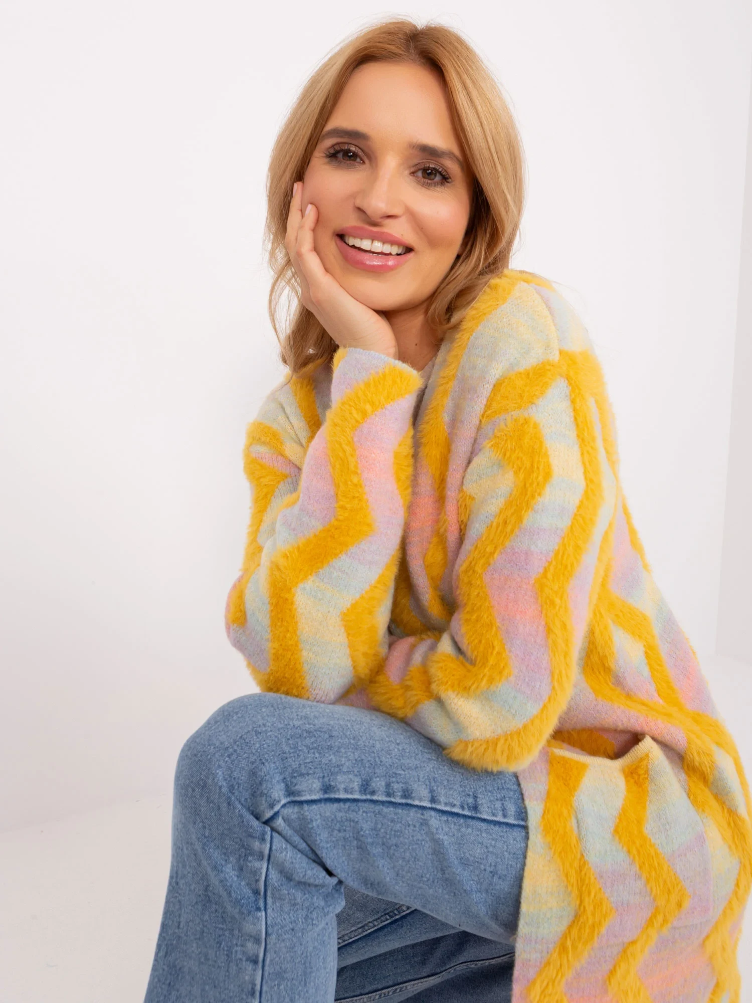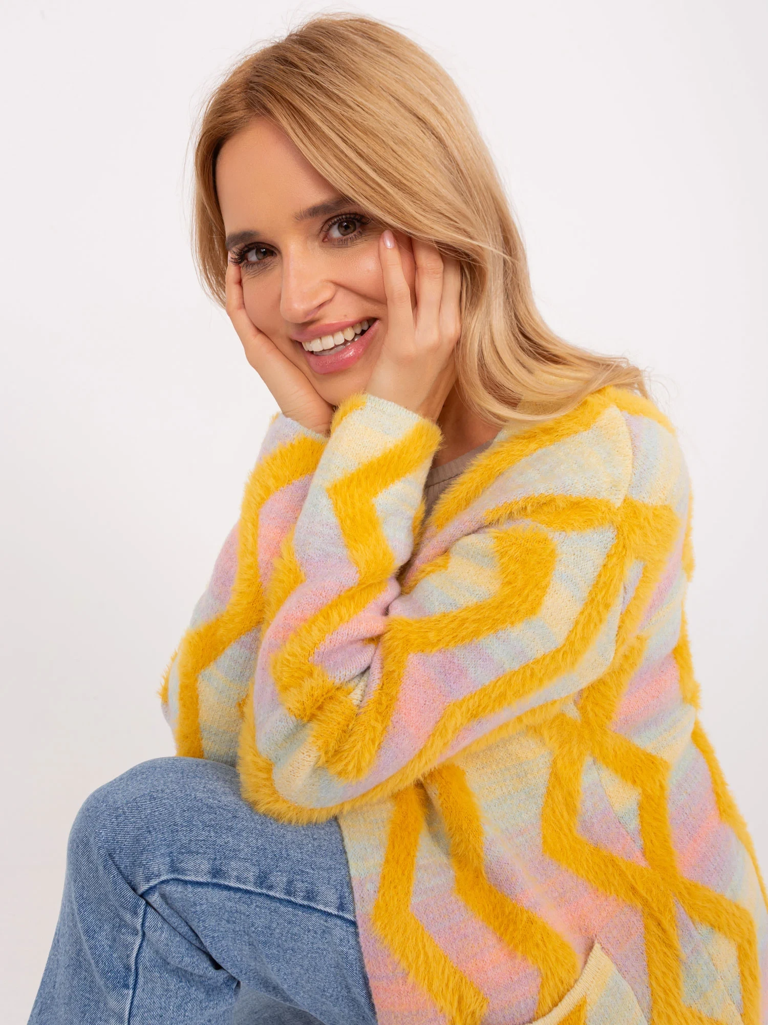 Žlutý svetr s geometrickým vzorem .
