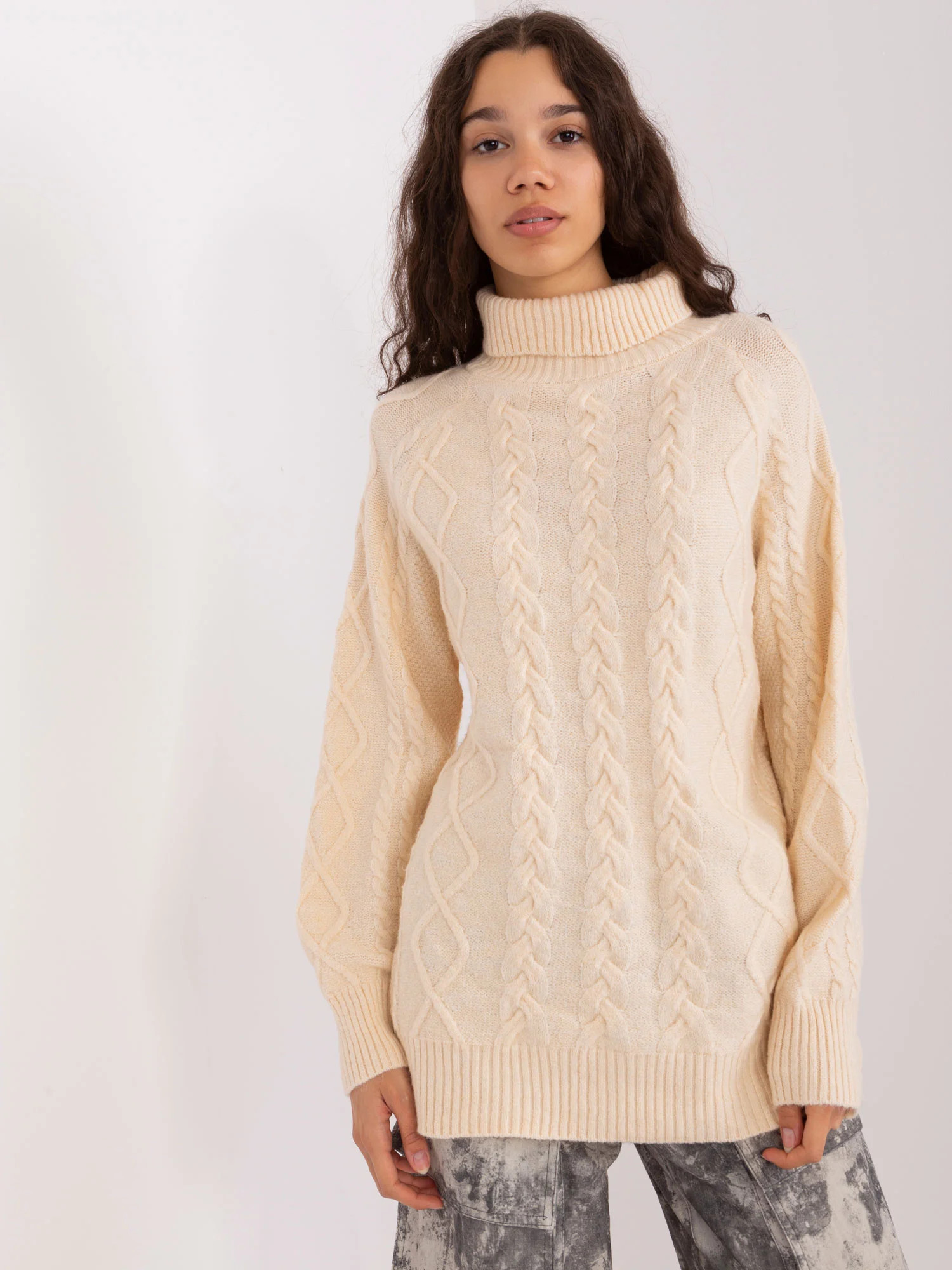 Rozměry svetru v jedné velikosti měřené na plocho: šířka v podpaží - 70 cm, délka rukávu - 60 cm, celková délka - 67 cm