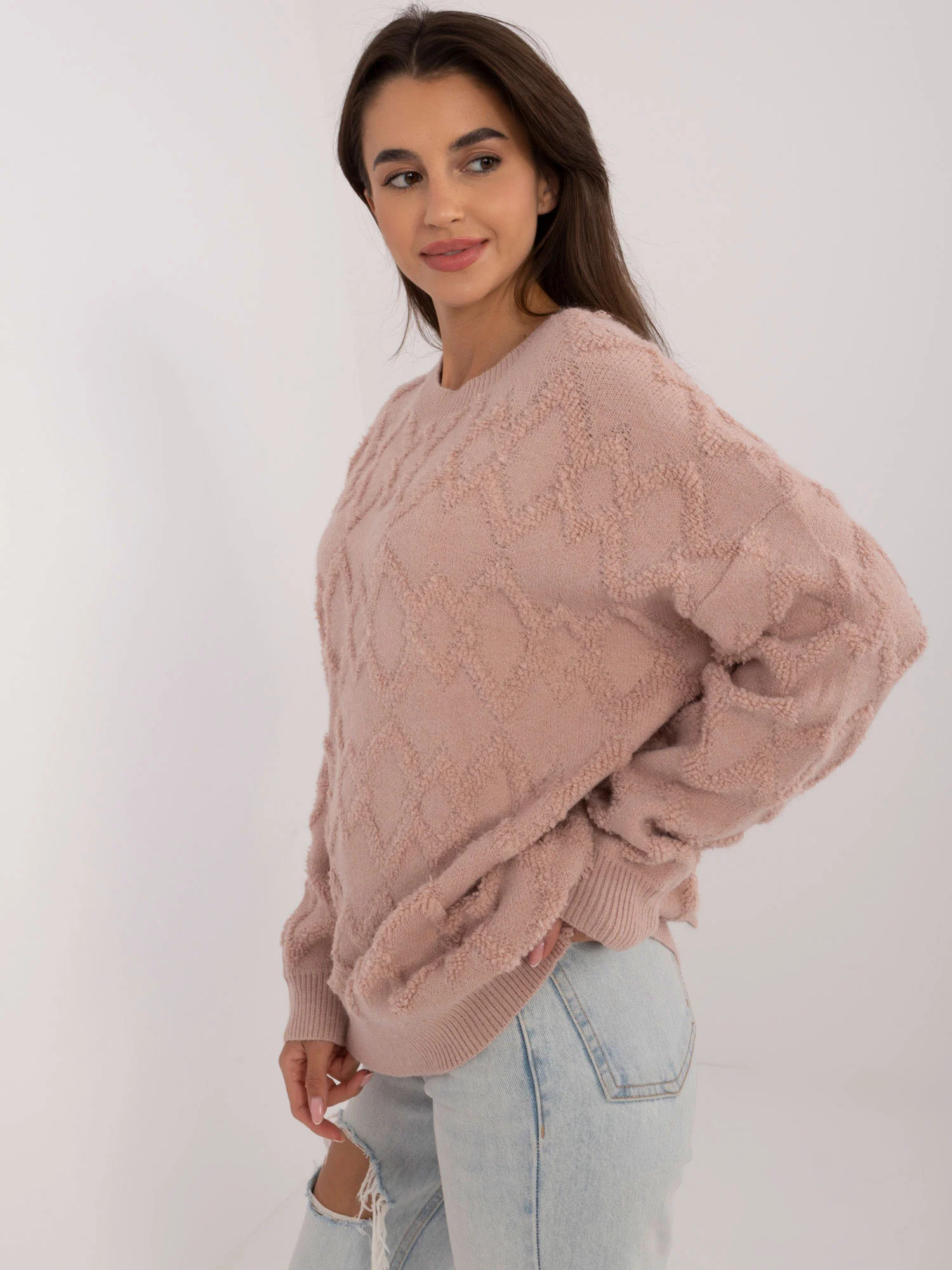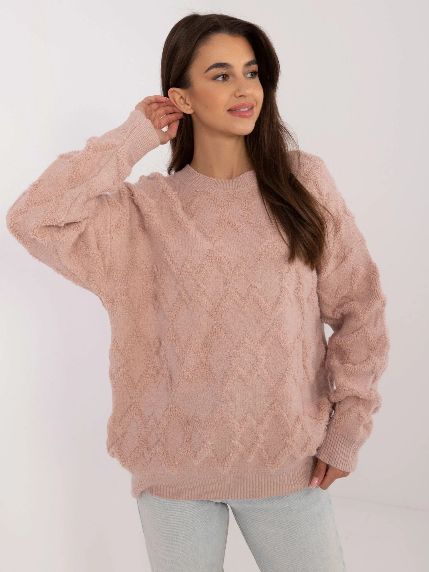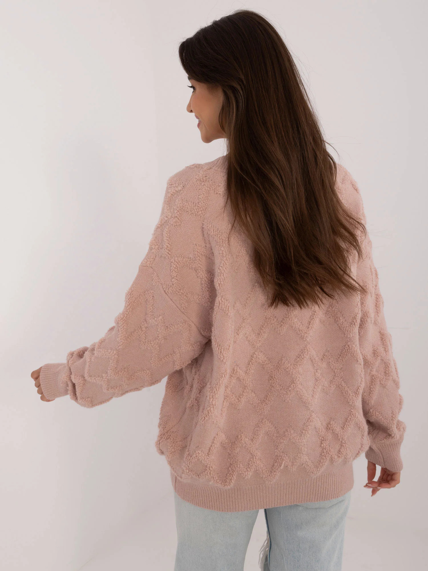 Rozměry svetru v jedné velikosti měřené na plocho: šířka v podpaží - 62 cm, délka rukávu - 60 cm, celková délka - 69 cm.