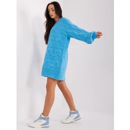 Modré pletené šaty s dlouhým rukávem .