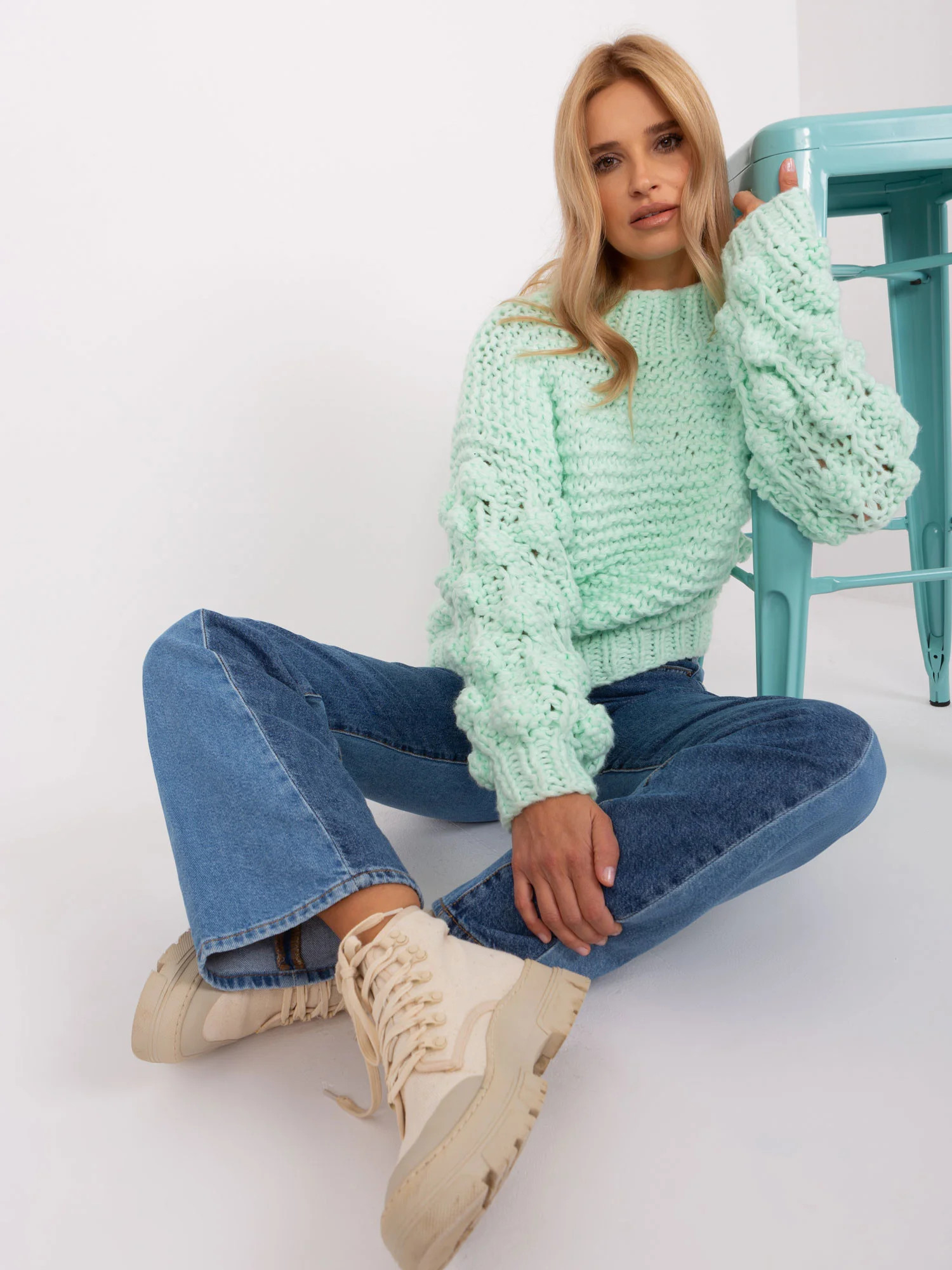 Mátový oversize svetr s hrubým úpletem .