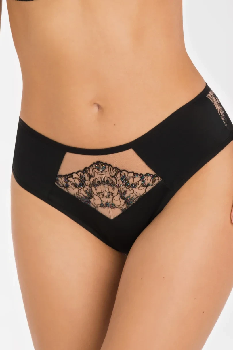 PŘEDNÍ ČÁST: z neprůhledného mikrovlákna, vsadka z výšivky podšitá stabilním tylem, nohavičky zakončené úzkou gumičkou.