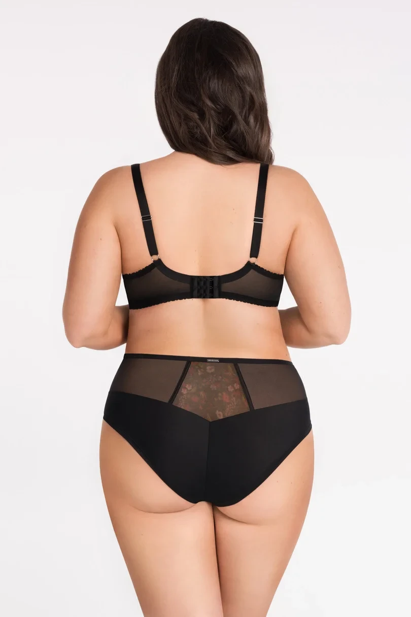 Zakrytý střih pokrývající téměř celý zadeček.z mikrovlákna s prvky z elastického tylu a potištěného stabilního tylu.ozdobné pruhy z elastické pásky na předním díle, švy překryté saténovou matnou páskou.zadní díl zakončený skládáním mikrovlákna naplocho.bavlněný rozkrok kovové prvky ve stříbrné barvě.