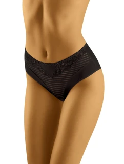 Částečně odhaluje a zvýrazňuje hýždě .z mikrovlákna s prvky z elastického tylu a potištěného stabilního tylu.na předním díle ozdobné pruhy z elastické pásky, švy překryté saténovou matnou páskou.zadní díl zakončený skládáním mikrovlákna naplocho.bavlněný rozkrok.kovové prvky ve stříbrné barvě.