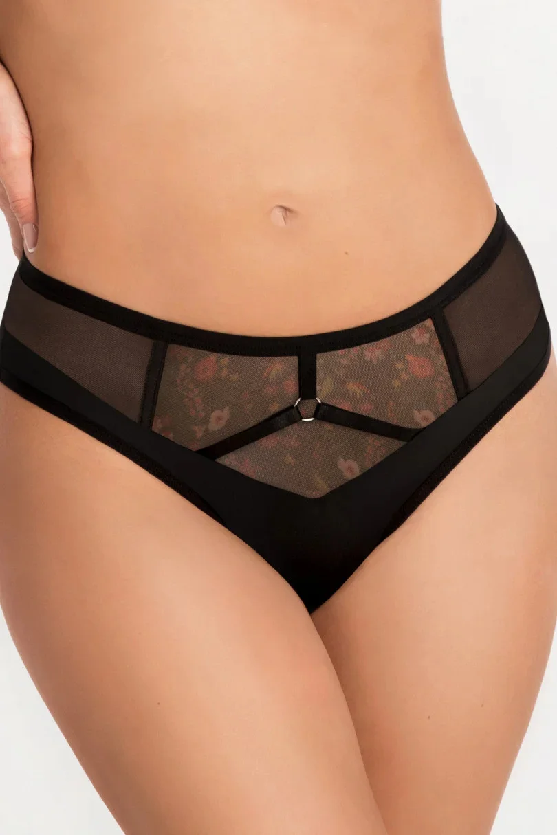 Částečně odhaluje a zvýrazňuje hýždě .z mikrovlákna s prvky z elastického tylu a potištěného stabilního tylu.na předním díle ozdobné pruhy z elastické pásky, švy překryté saténovou matnou páskou.zadní díl zakončený skládáním mikrovlákna naplocho.bavlněný rozkrok.kovové prvky ve stříbrné barvě.