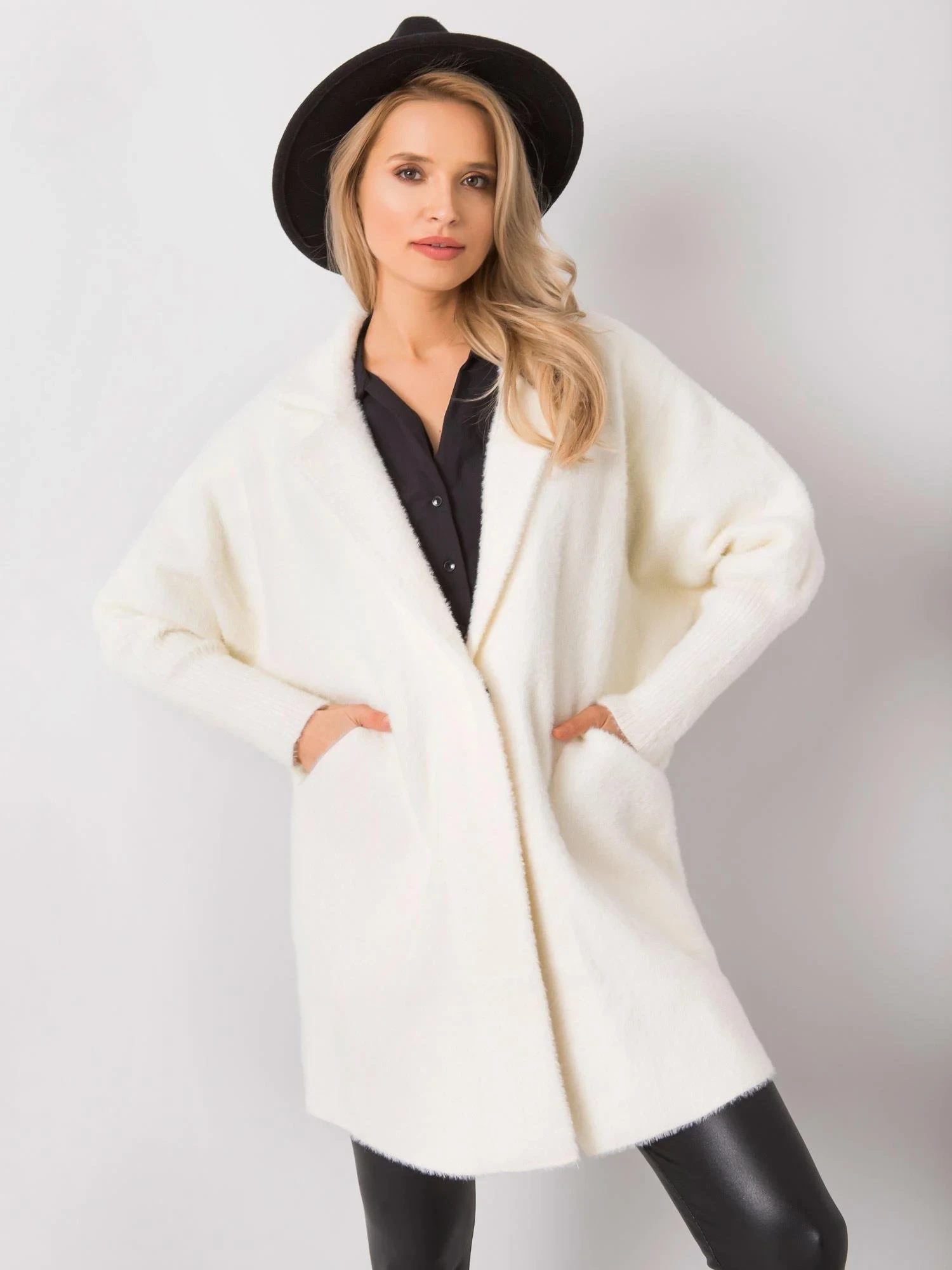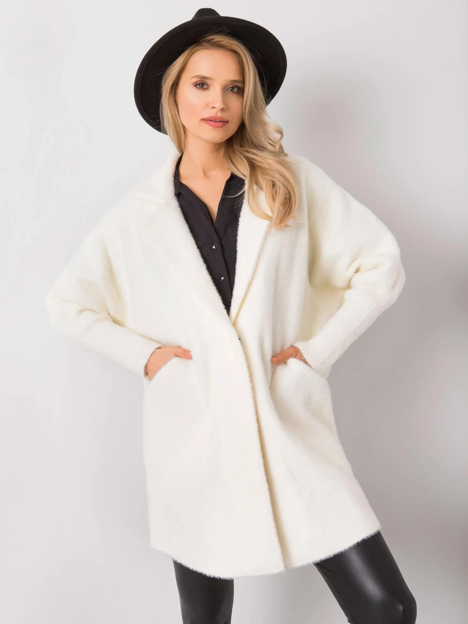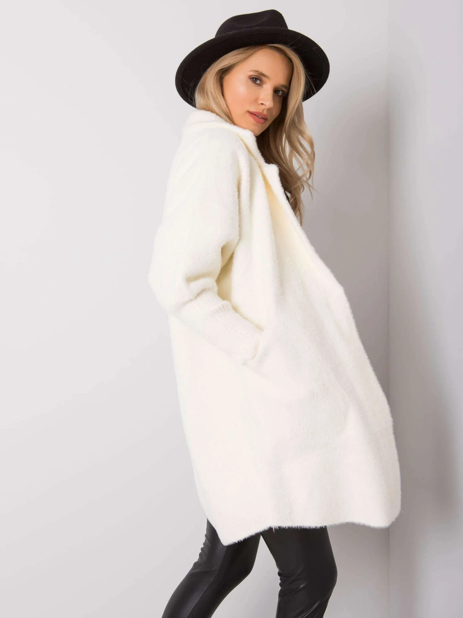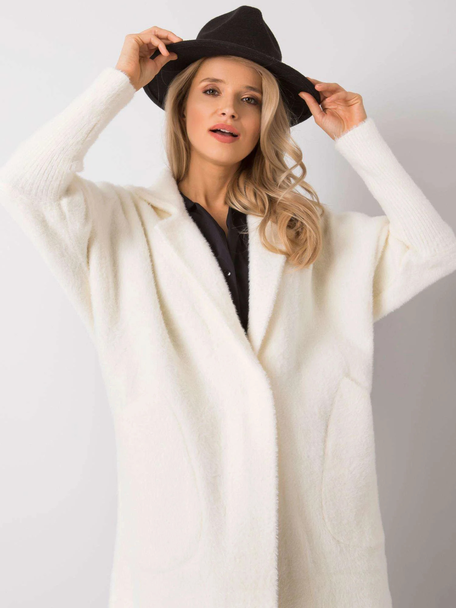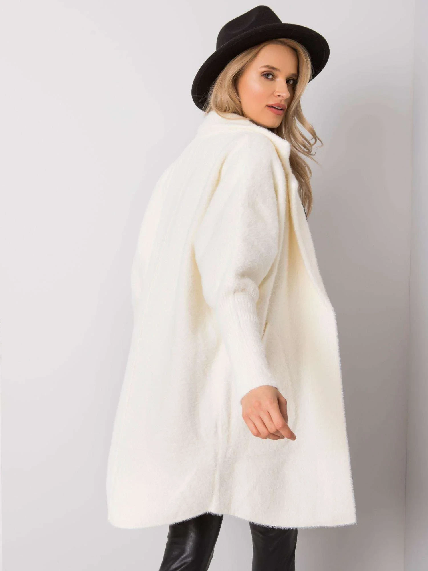 Chlupatý kabát z alpaky v barvě ecru.