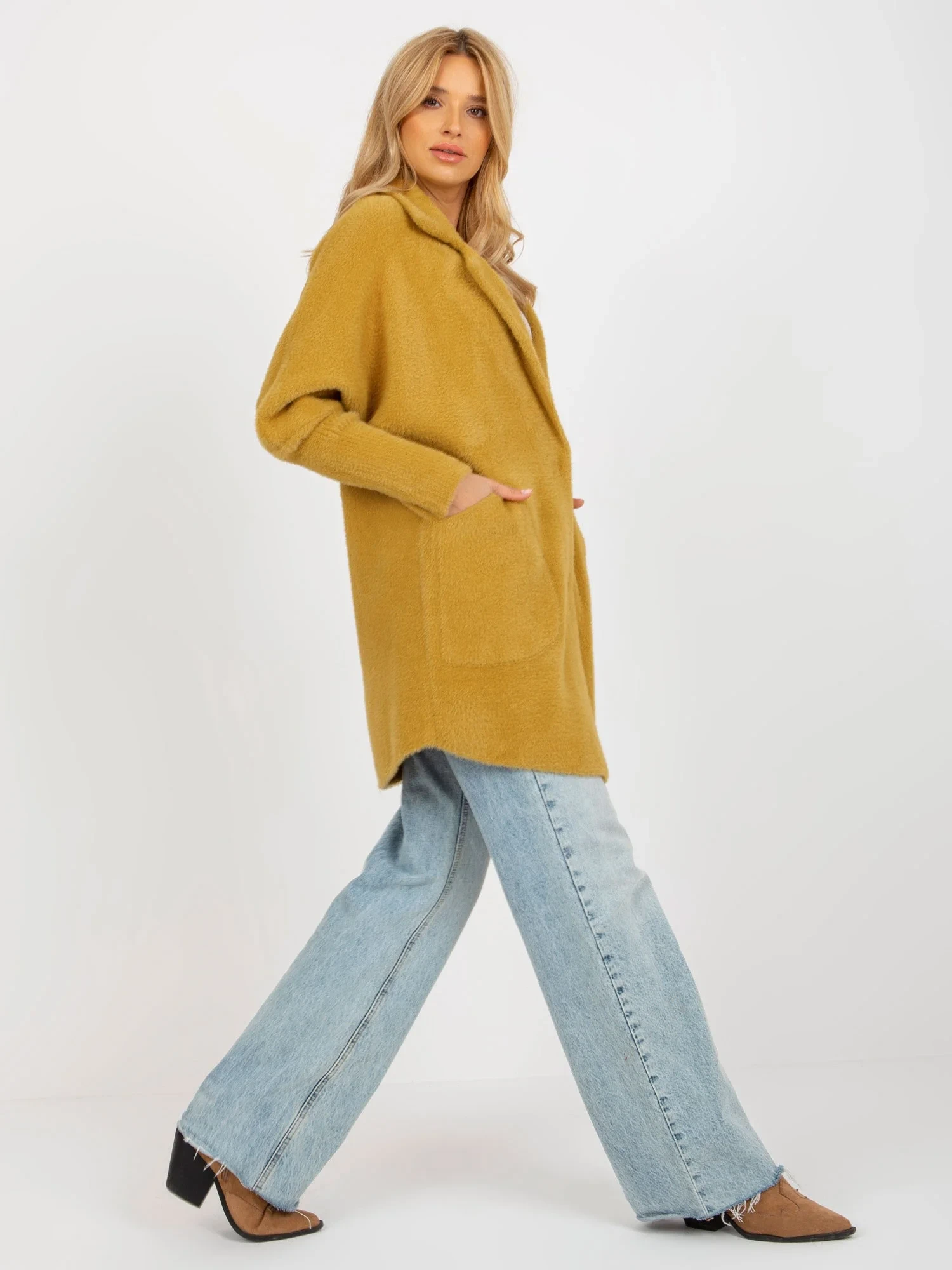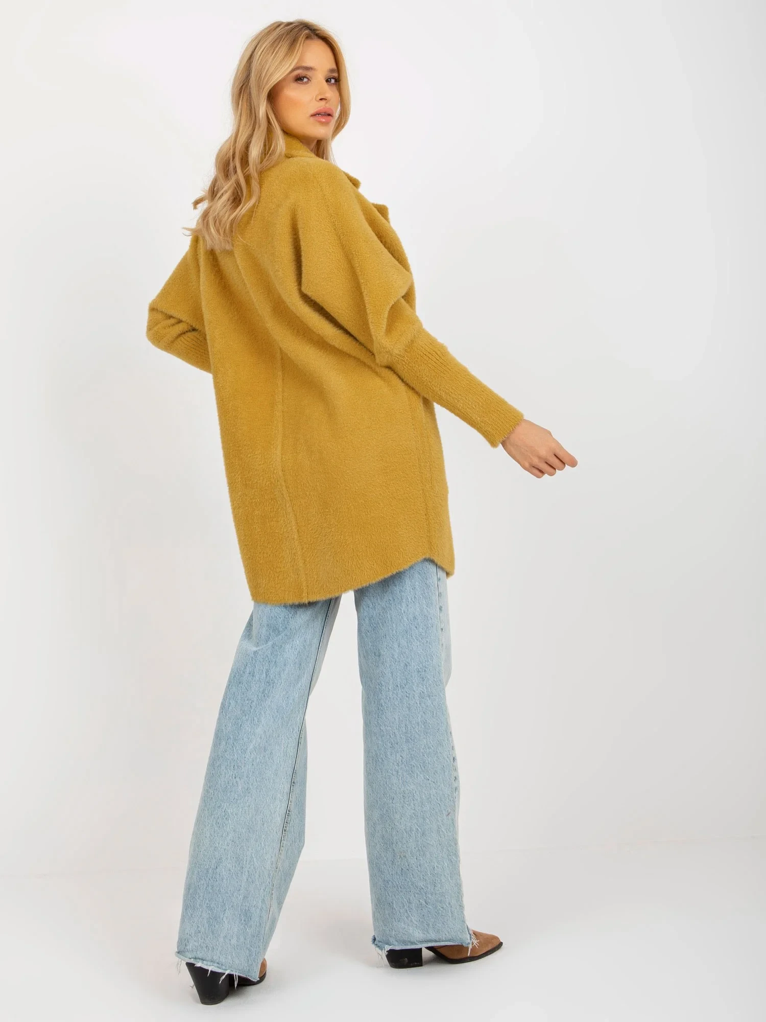 Hořčicový volný kabát z alpaky s kapsami .