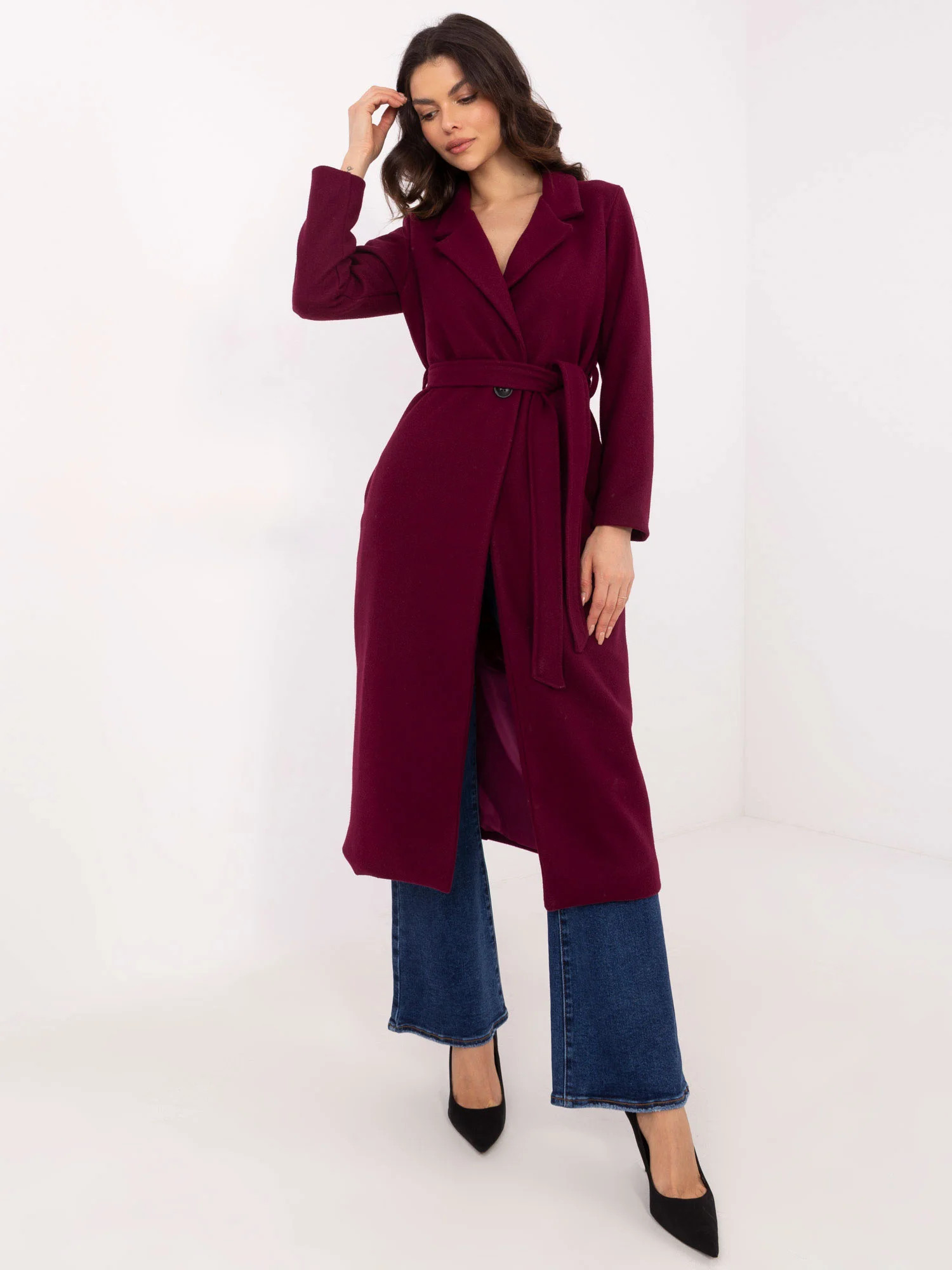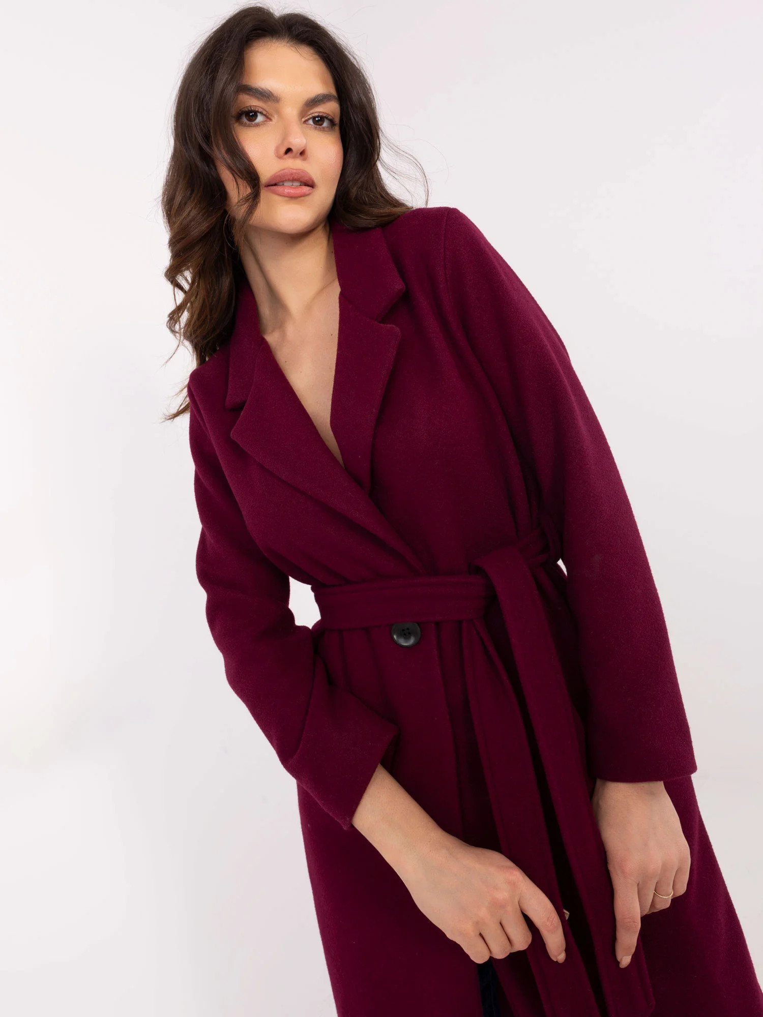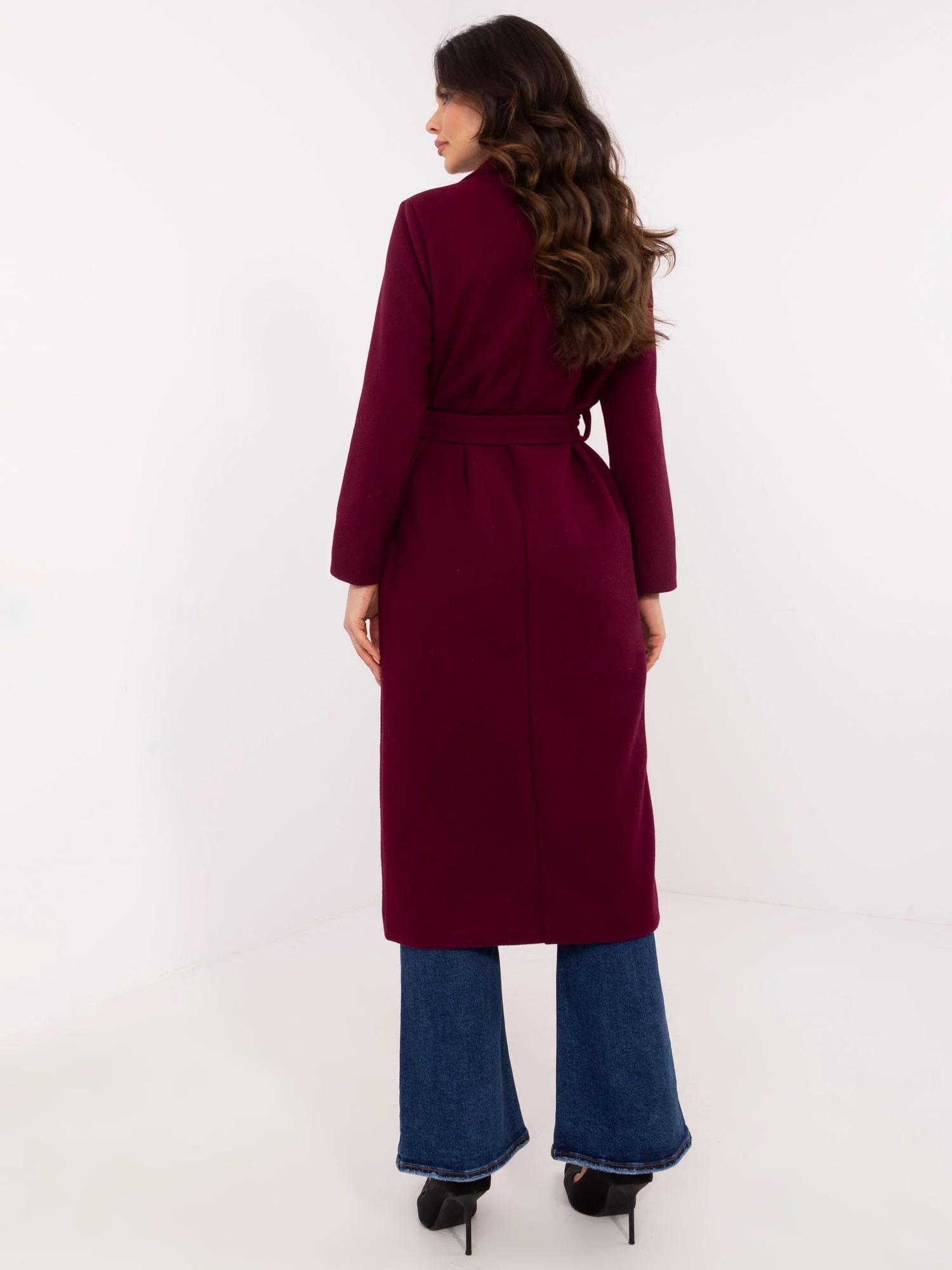 Wymiary płaszcza w rozmiarze S mierzone na płasko: szerokość pod pachami - 47 cm, długość całkowita - 118 cm, długość rękawa - 56 cm.