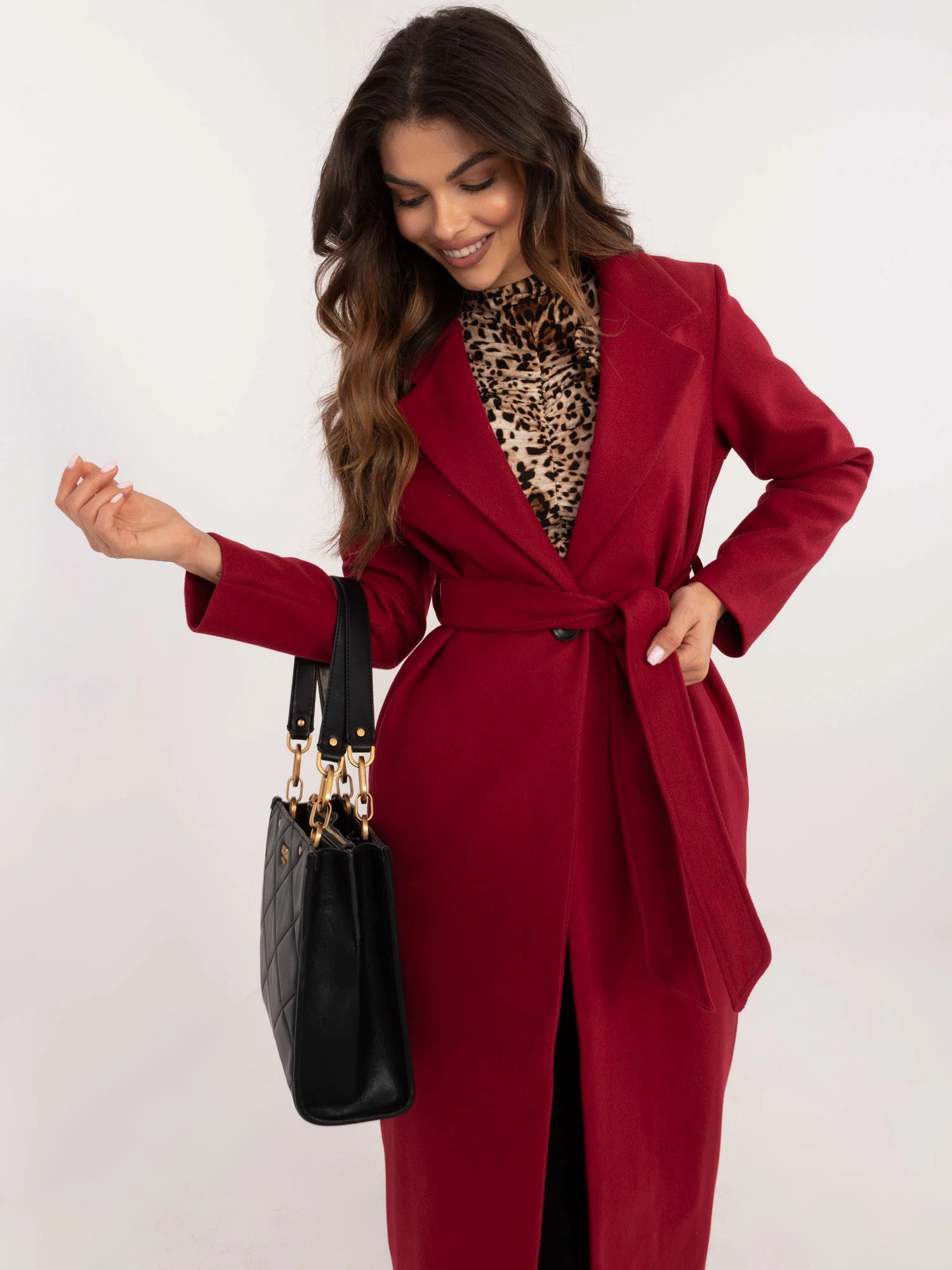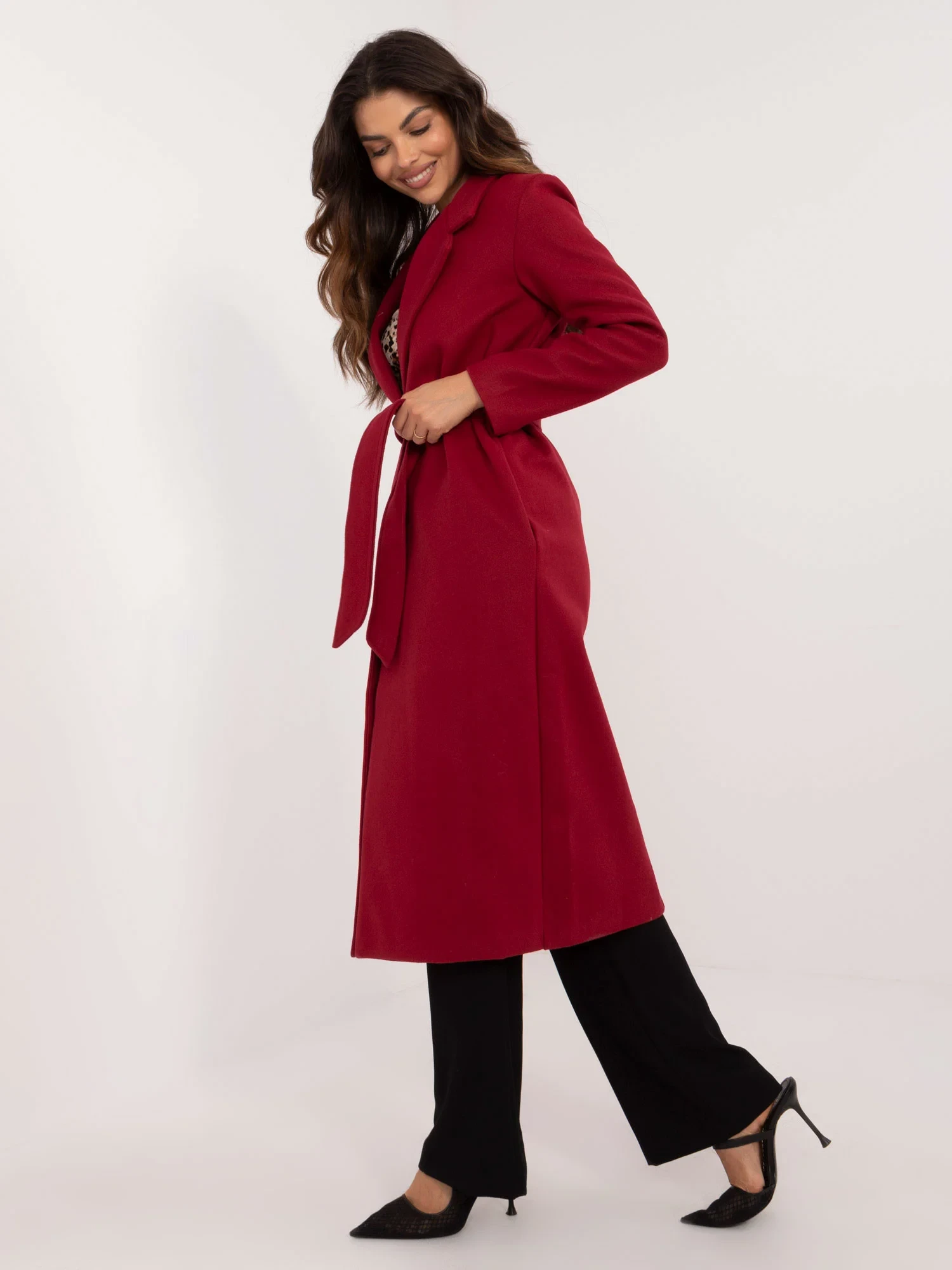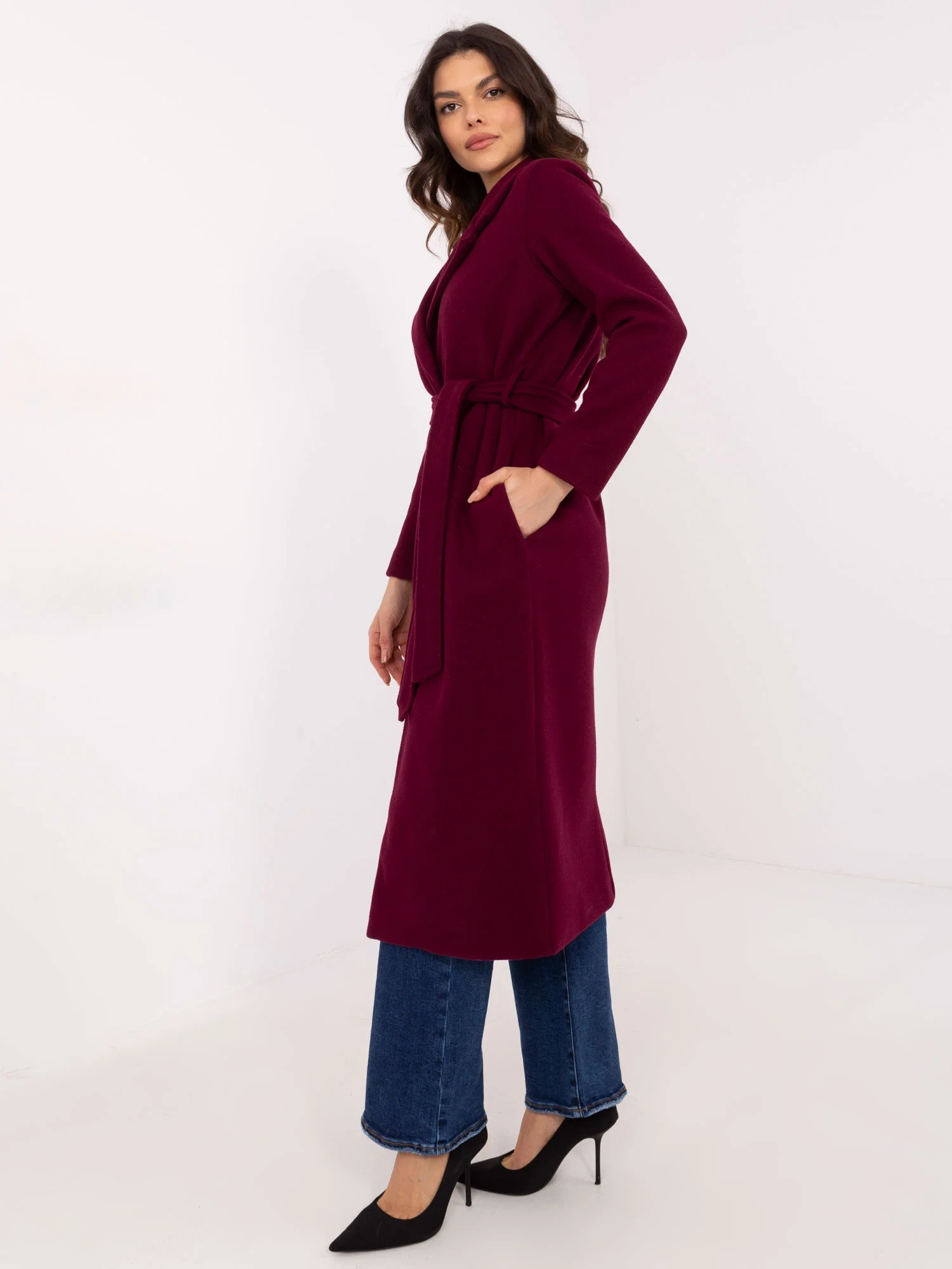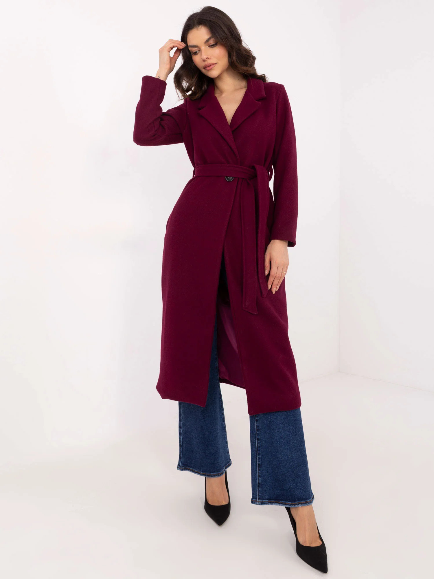 Wymiary płaszcza w rozmiarze S mierzone na płasko: szerokość pod pachami - 47 cm, długość całkowita - 118 cm, długość rękawa - 56 cm.