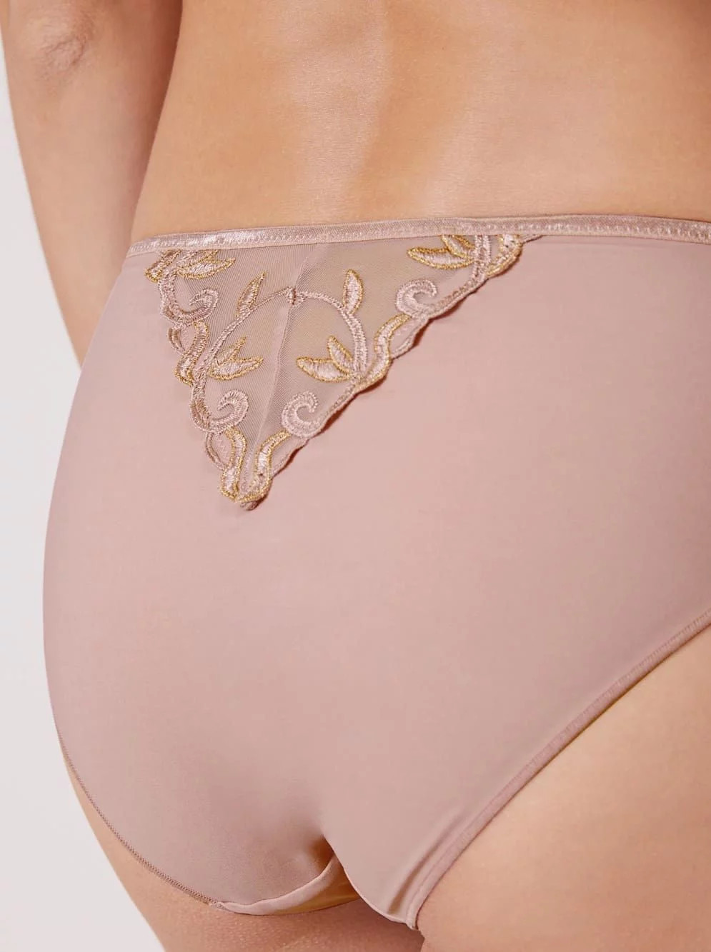 Kalhotky s vysokým pasem z úpletu. Neprůhledná pletená přední část. Zadní díl z neprůhledného úpletu a měkký elastický lem kolem stehen.