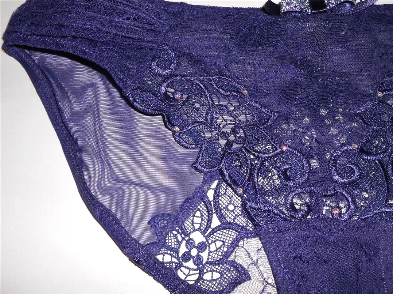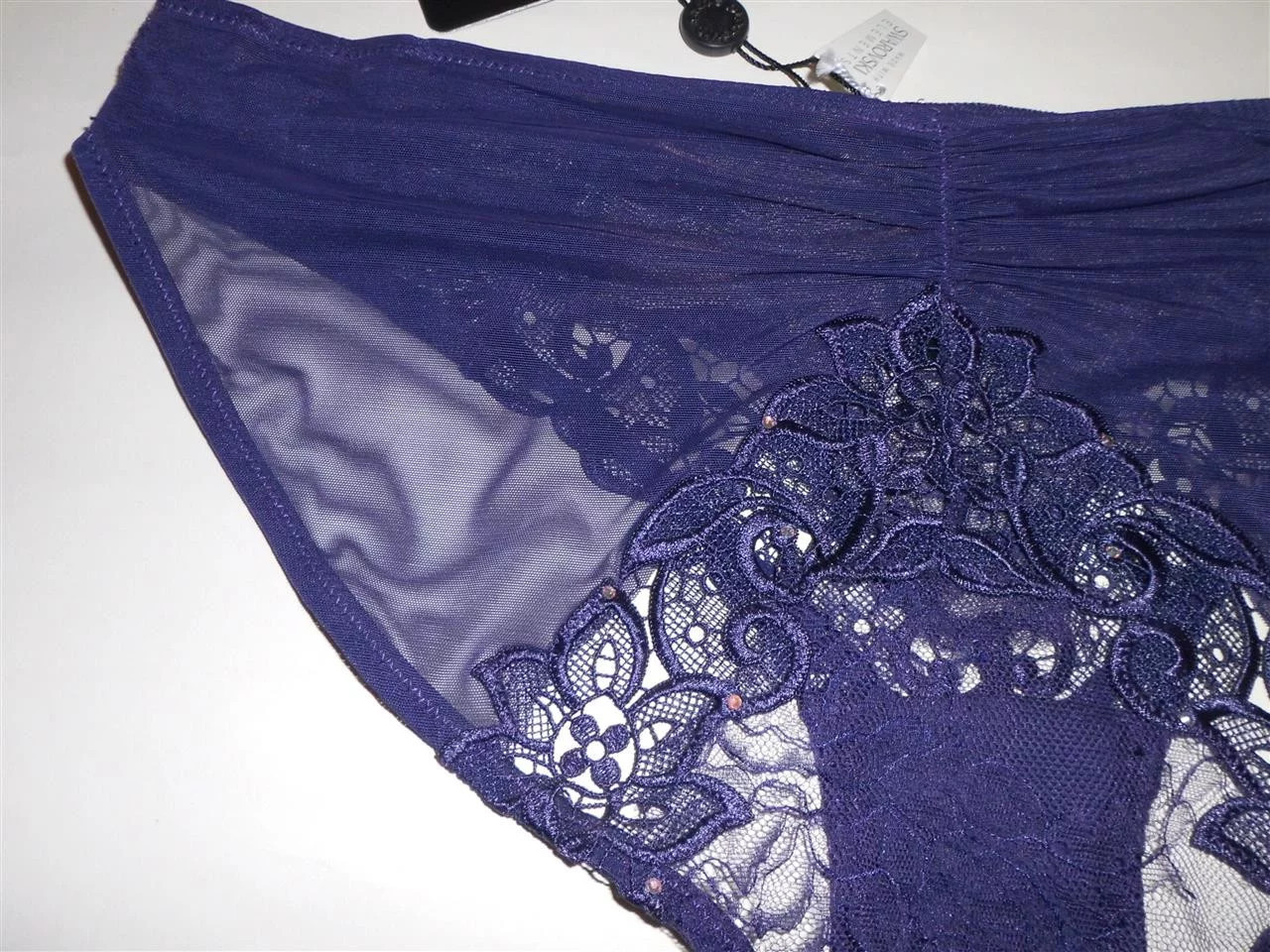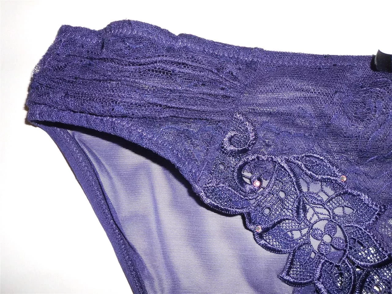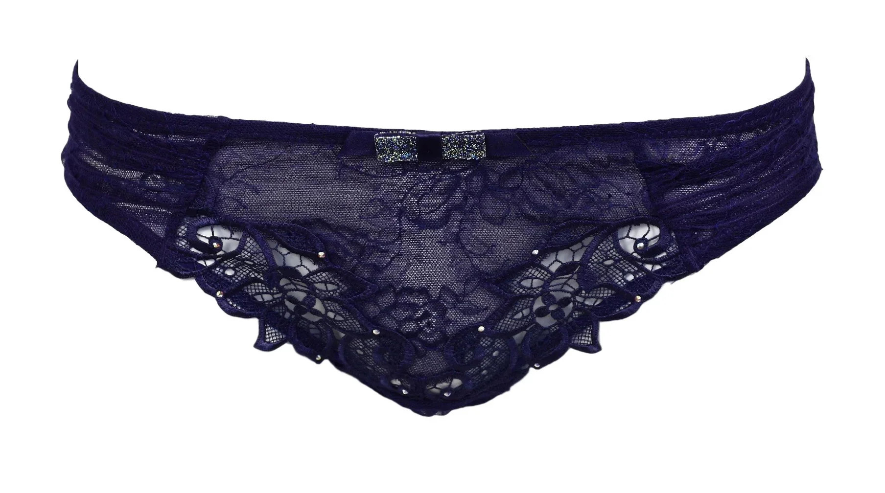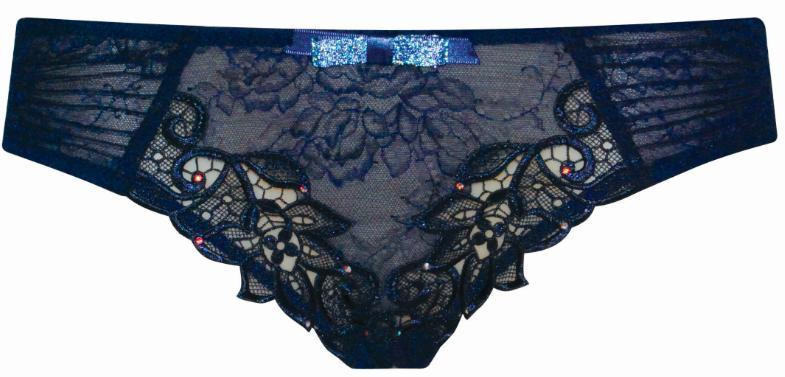 Luxusní krajkové kalhotky tmavě fialové barvy, jsou rafinovaně zdobené úžasnou výšivkou a vykládány kamínky Swarovski. Složení: 60% polyamid, 40% polyester.