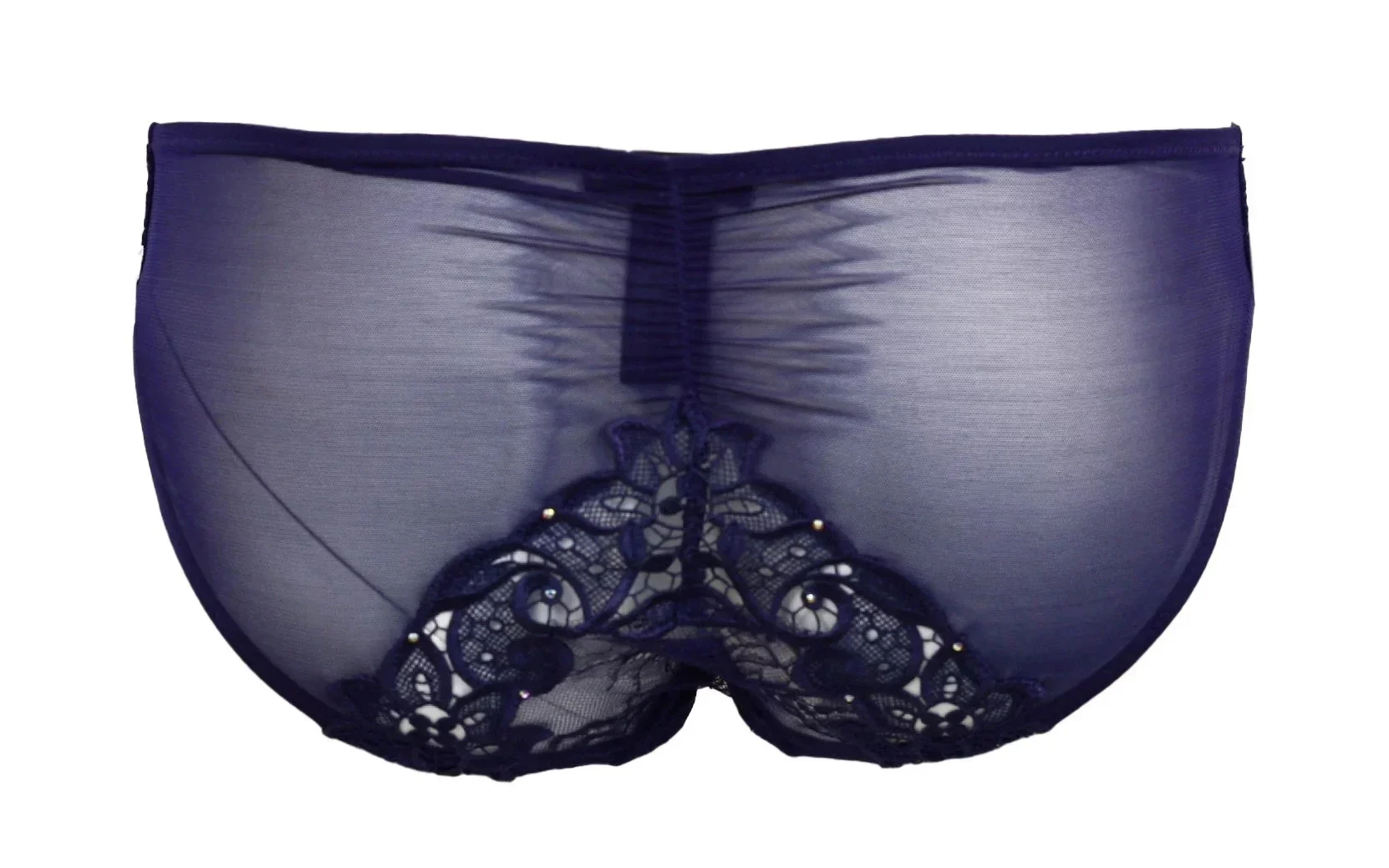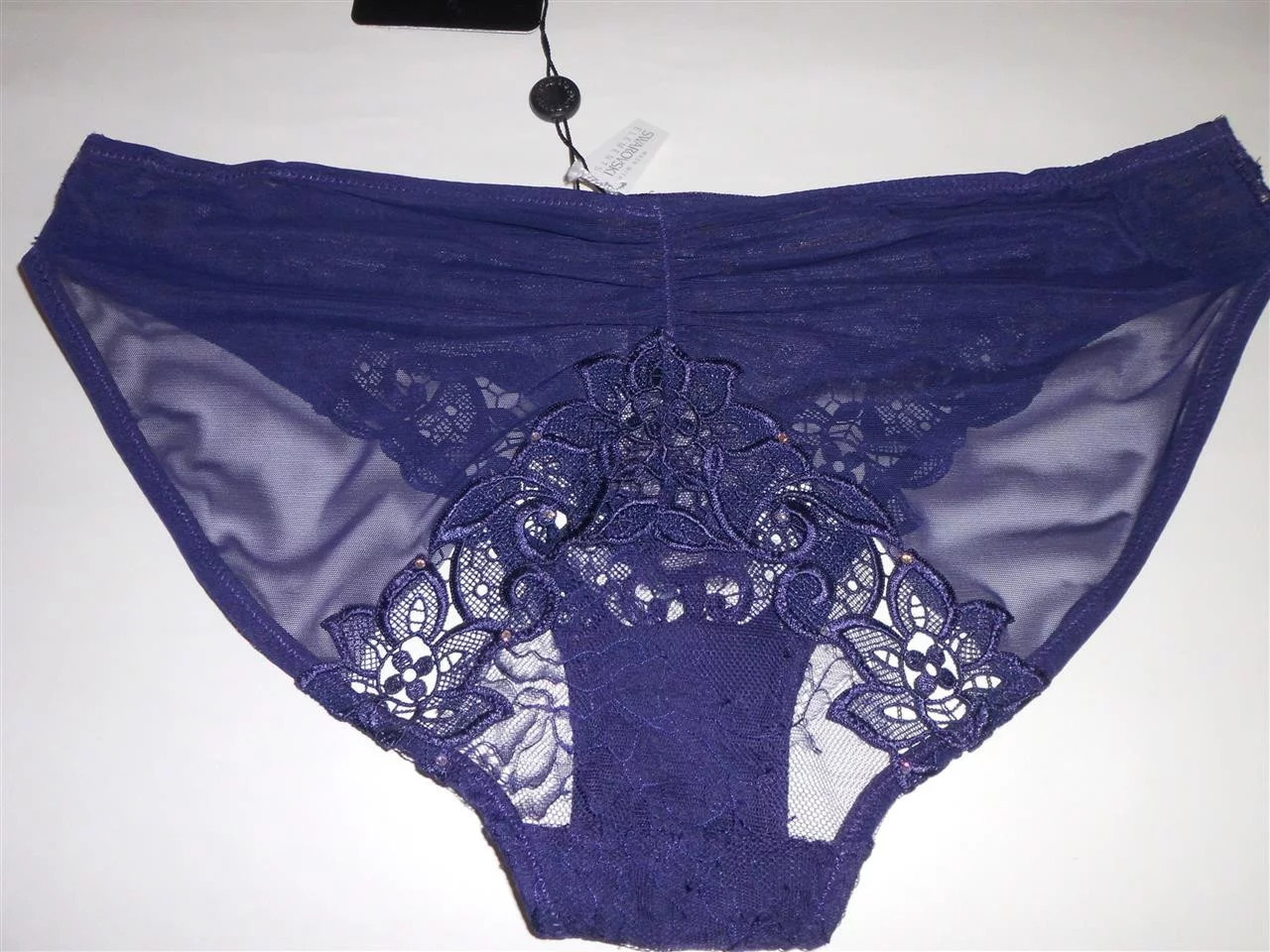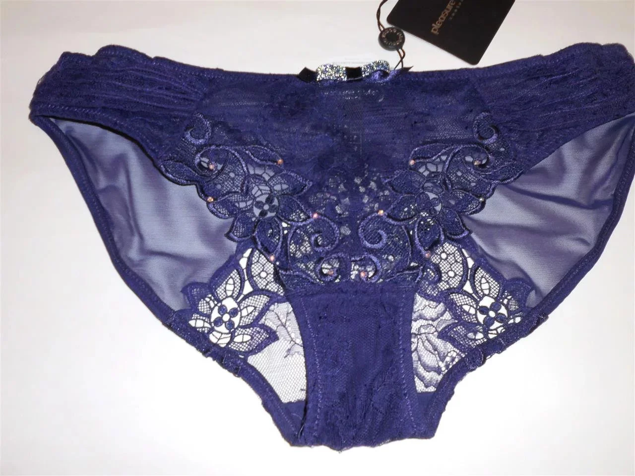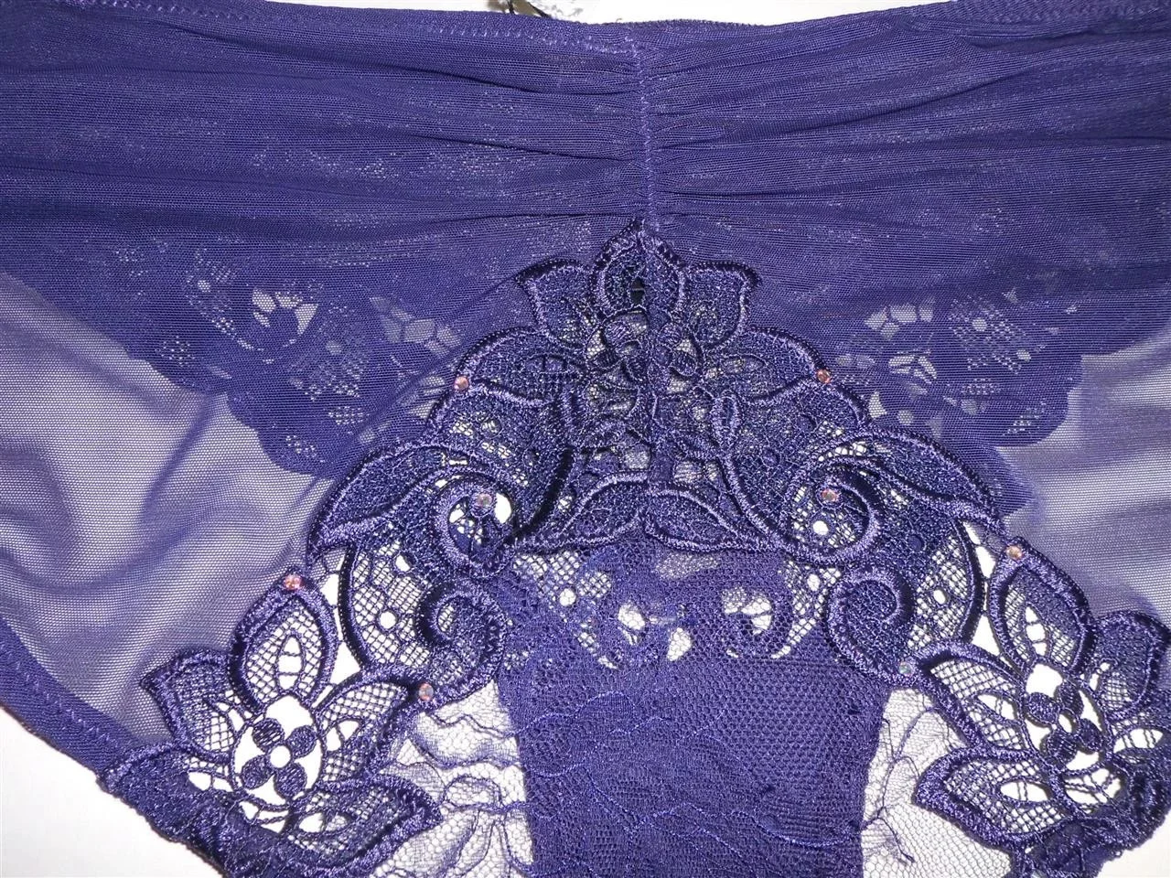 Luxusní krajkové kalhotky tmavě fialové barvy, jsou rafinovaně zdobené úžasnou výšivkou a vykládány kamínky Swarovski. Složení: 60% polyamid, 40% polyester.
