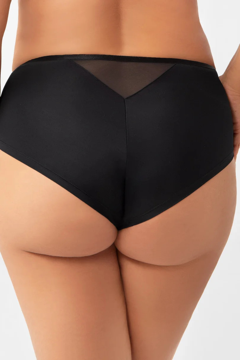 Wyższy stan. Zabudowany fason zasłaniający prawie całe pośladki. W Wykonane z kryjącej microfibry połączonej z tiulem elastycznym ze wstawkami z haftu na tiulu stabilnym. Tył wykończony poprzez podwinięcie krawędzi microfibry na płasko. Bawełniany kroczek.