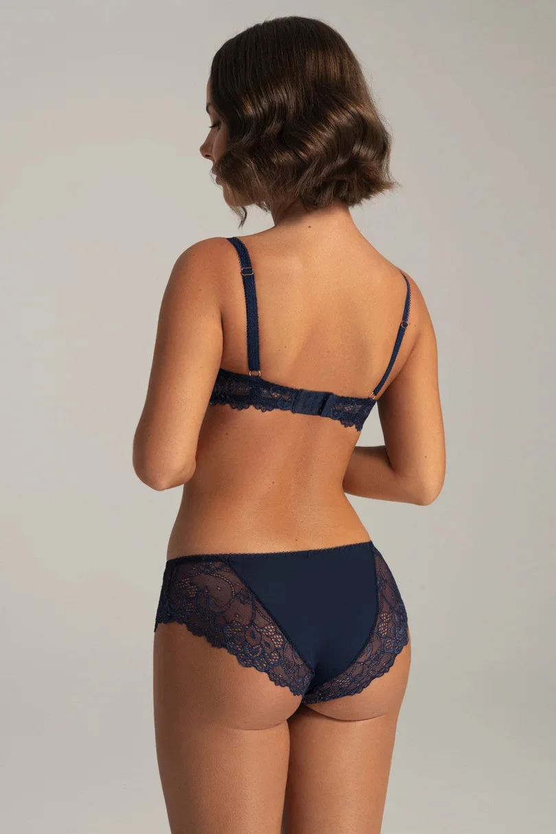 Figi w kolorze granatowym to elegancka i zmysłowa propozycja, która łączy klasykę z nowoczesnym stylem. Przód fig wykonany jest z pięknej granatowej koronki naszytej na beżową bawełnę, wyższy stan nie tylko zapewnia komfort, ale również subtelnie podkreśla kobiece kształty. Boki i tył majtek ozdobione są delikatną koronką, a centralna część tylna wykonana jest z miękkiej mikrofibry, która idealnie dopasowuje się do sylwetki. Te figi to połączenie elegancji i wygody, które sprawdzi się zarówno na co dzień, jak i na specjalne okazje.